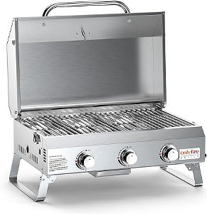 Parrilla de gas de mesa de 3 quemadores, parrilla de propano portátil de acero inoxidable con patas plegables para patio al aire libre, campamento, portón trasero, viaje en caravana