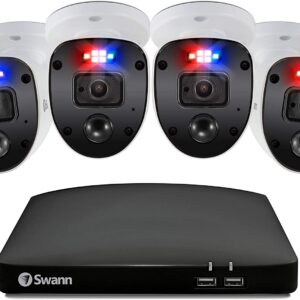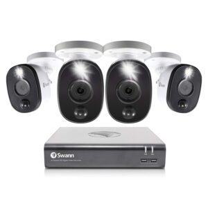Swann SWDVK-846804SL – Sistema de seguridad DVR de 8 canales y 4 cámaras, con cable de vigilancia 4K HD DVR + disco duro de 1 TB, captura de audio, visión nocturna a color, luz de estrellas con sensor de calor y movimiento, Alexa + Google