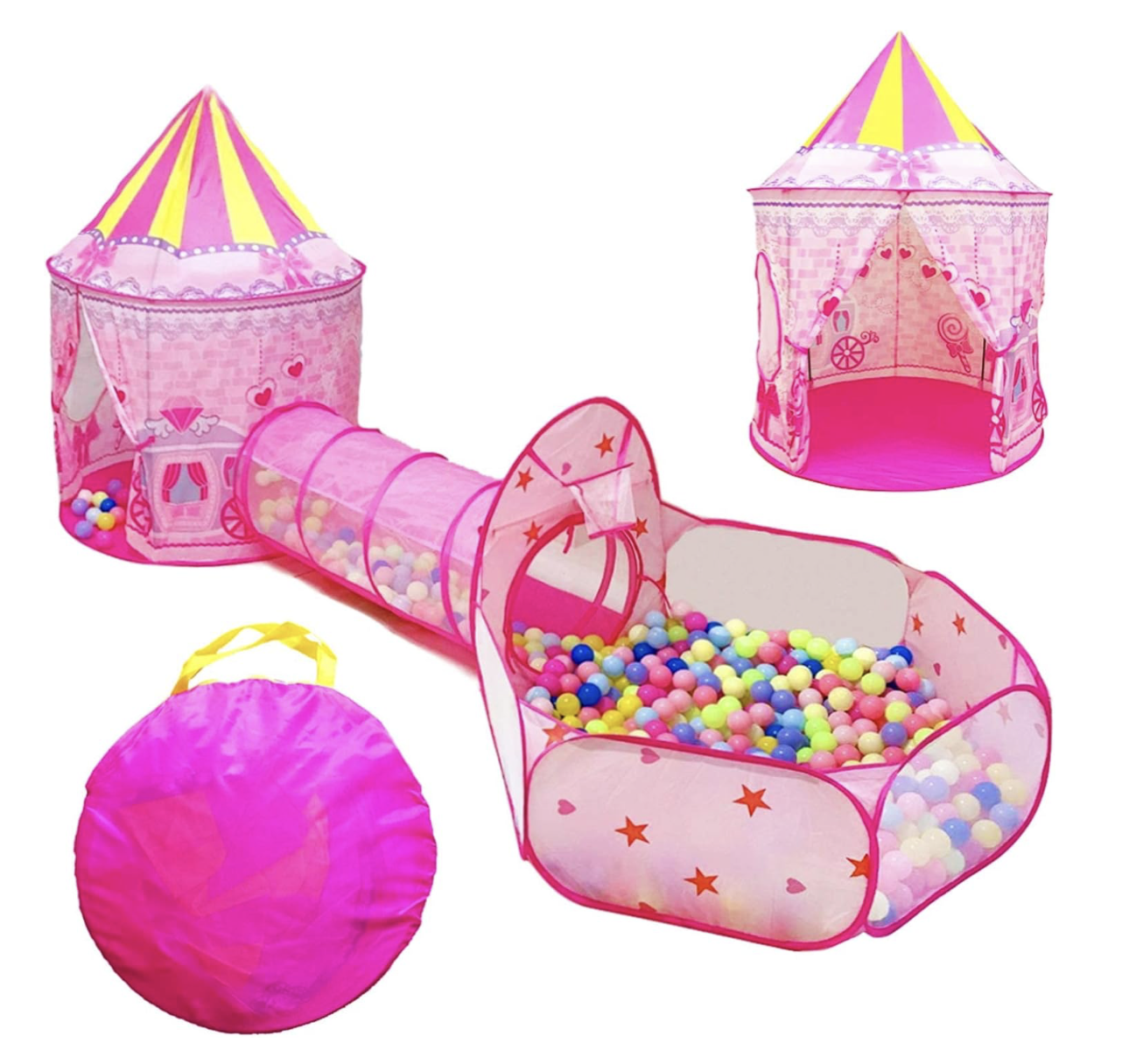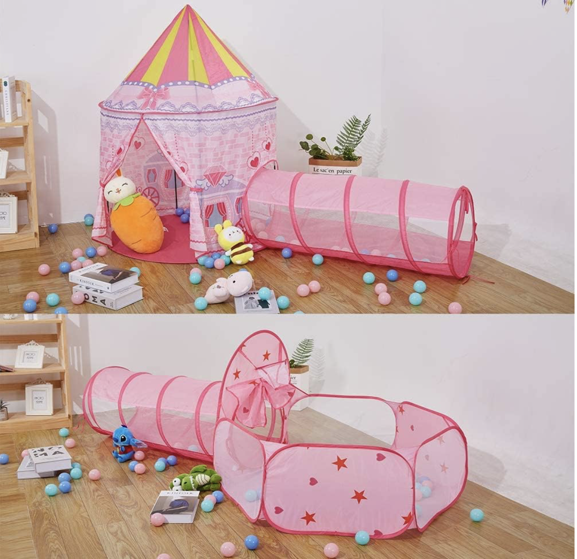 - Diseño 3 en 1: Esta casa de juegos para niñas de color rosa mantendrá a tus hijas entretenidas durante horas. Incluye una tienda de campaña con diseño de princesa, funda de transporte con cremallera, una piscina de pelotas y un túnel de gateo. Las niñas pueden adecuar este juego con muchas combinaciones diferentes para que siga siendo divertido y emocionante. Un artículo imprescindible para bebés, gatos y perros.