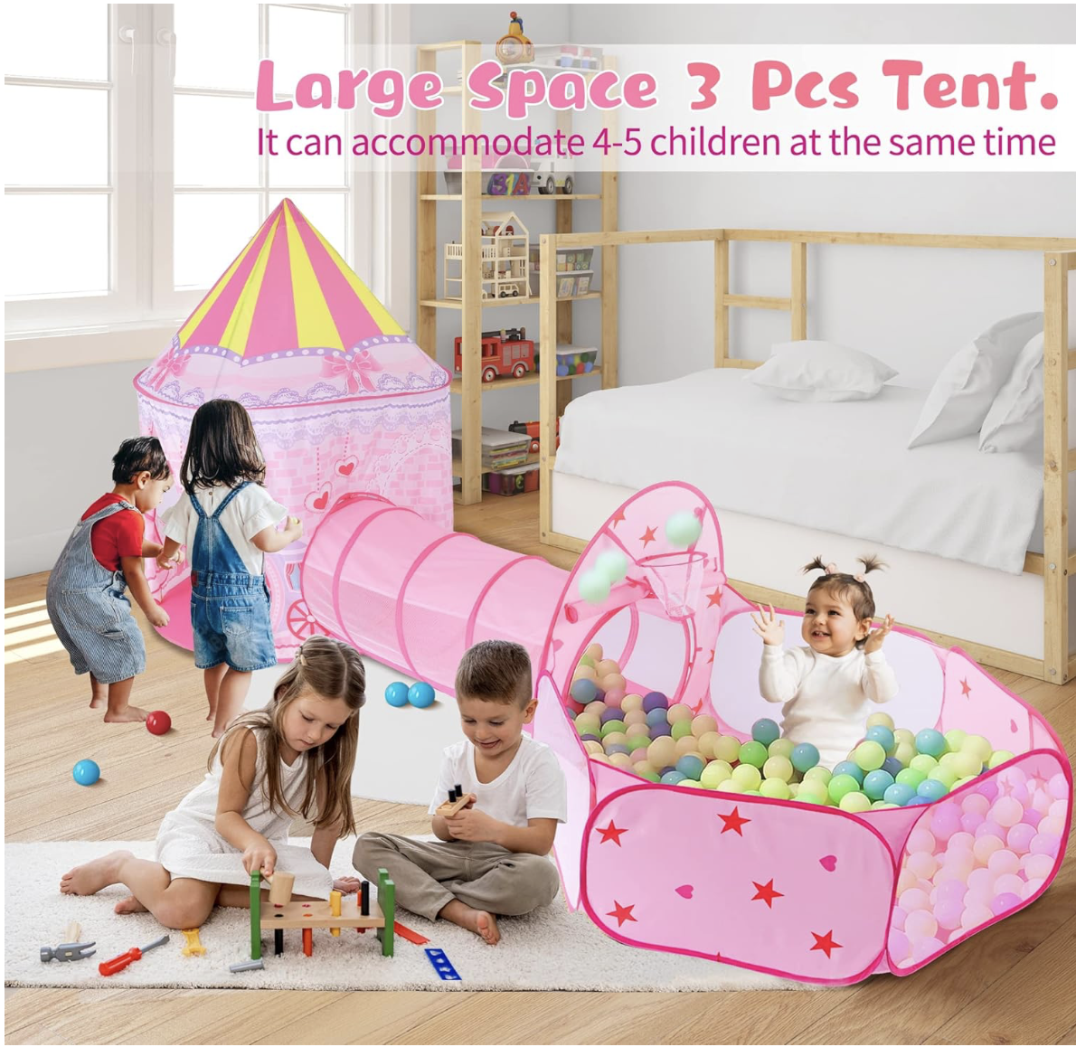 Tienda de campaña para niña con diseño de cuento de hadas, tiene túnel de rastreo y piscina de pelotas con aro de baloncesto para niñas pequeñas