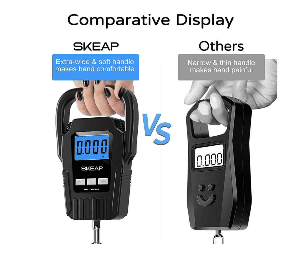 - Mango duradero y cómodo: a diferencia de otras básculas de pesca, la báscula colgante digital SKEAP está equipada con el mango recubierto de plástico ABS duradero que te hace sentir cómodo al colgar objetos pesados. También es conveniente sostener el mango con la mano sin dejar ningún dolor y marcas.