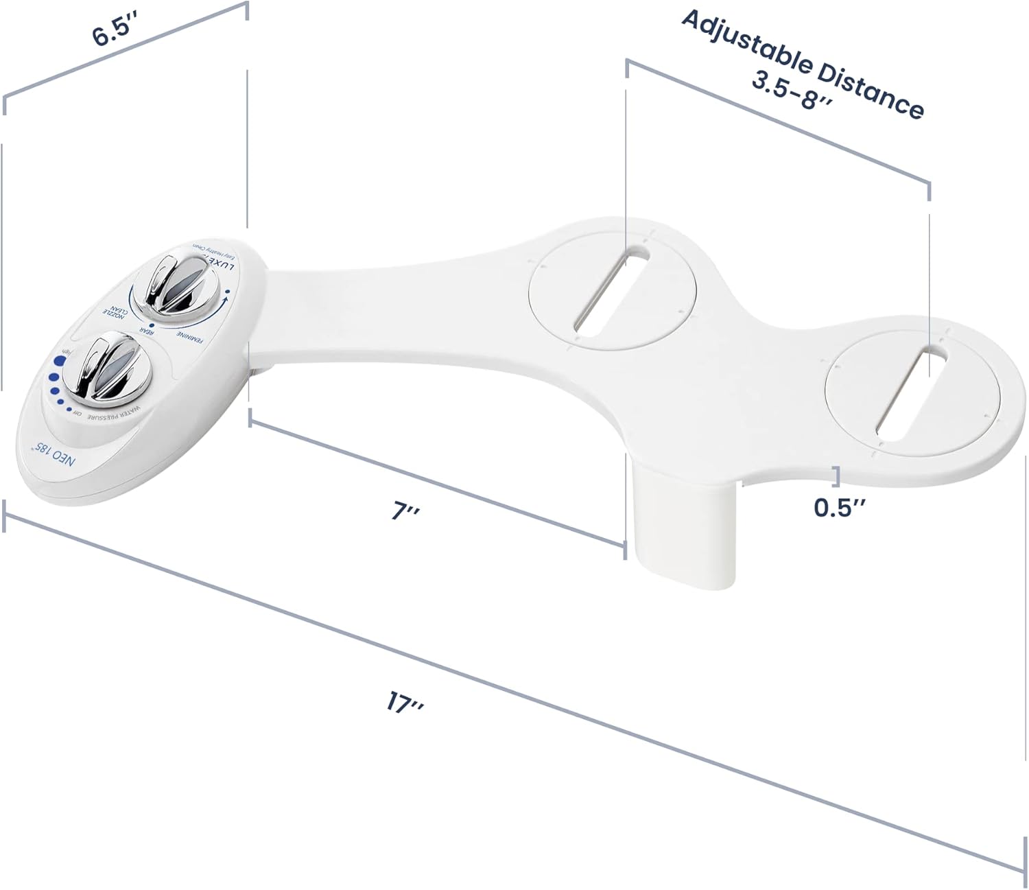 Bidé de para inodoro Luxe Bidé Neo 185 (Elite Series), boquilla doble auto limpiante, agua dulce, no eléctrico, mecánico, con fuertes válvulas de grifo y mangueras de metal, Neo 185 Blanco