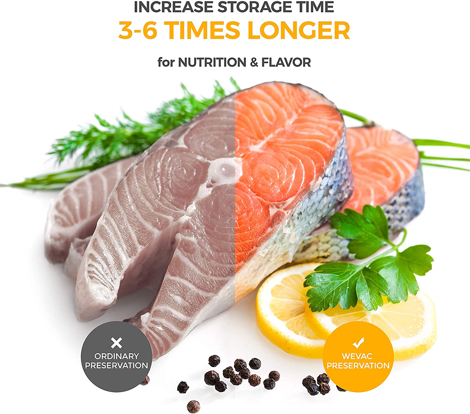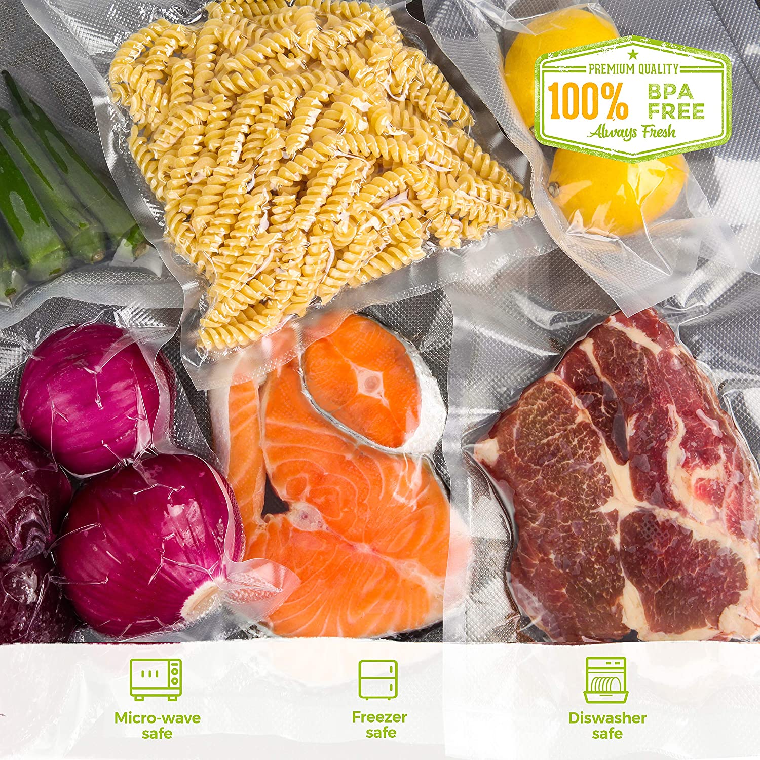 - Aumenta el tiempo de almacenamiento para nutrición y sabor: 4 – 8 veces más larga vida útil de los alimentos, bloquea la frescura, el sabor y la nutrición en el interior. Bolsas resistentes de 2 capas con canal de extracción de aire en relieve que son estables para el calor y el frío, hervir, congelable, microondas y lavavajillas. Perfecto para cocinar al vacío. Elimina quemaduras en el congelador y la deshidratación para mantener tu comida más fresca, jugosa y sabrosa.