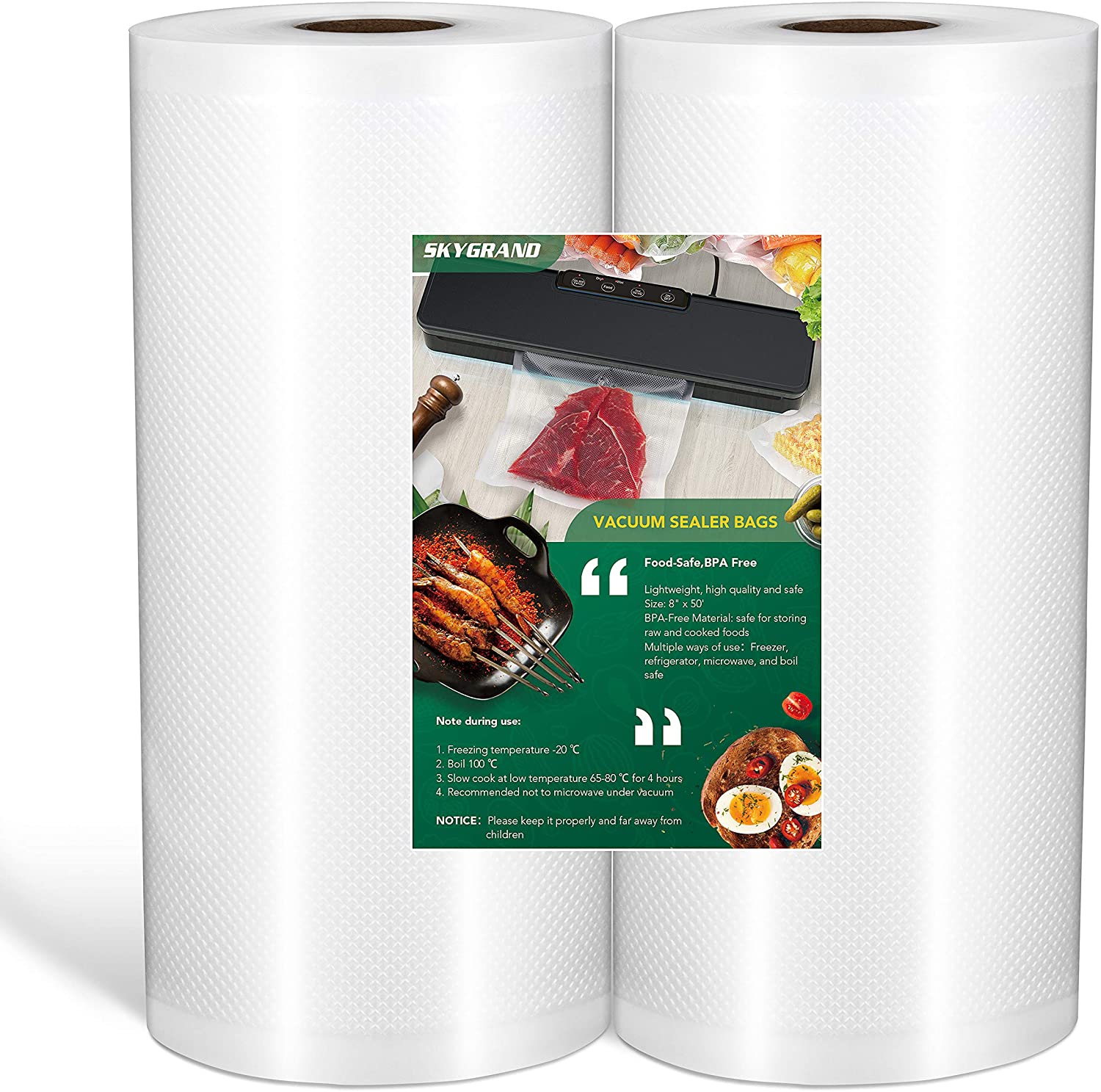 - Gran valor: 2 paquetes de rollos de 8 pulgadas por 50 pies con canales en relieve para aumentar la succión, con Skygrand Guaeds para evitar perforaciones, mantener fresco sin quemaduras por congelador o deshidratación. Diseño sin precortes, crea tu propia longitud de bolsa. Menos desperdicio de alimentos, ahorra mucho dinero. Mejor oferta.
