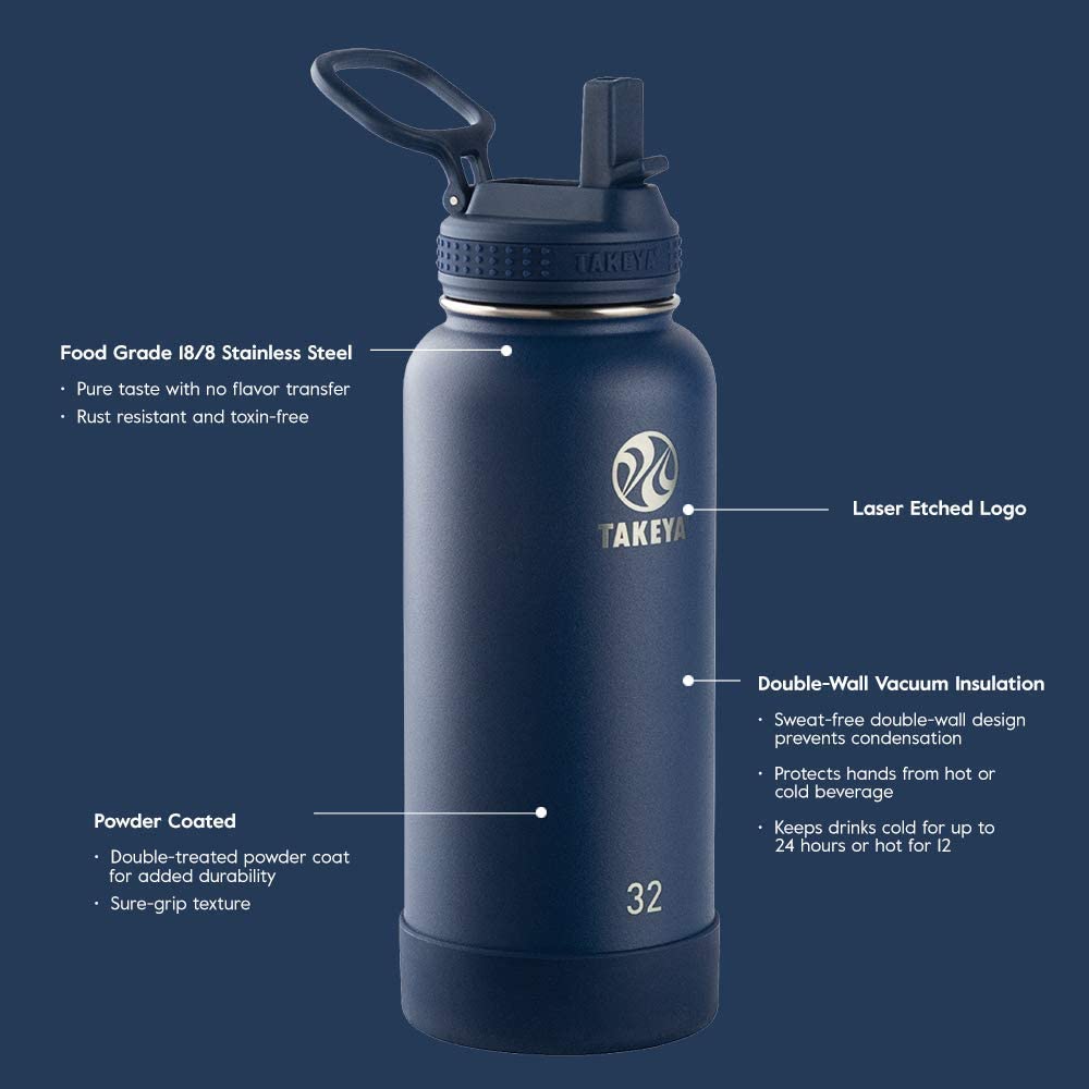 - Botella de agua aislada activa: la botella de agua de acero inoxidable Takeya Actives es una botella de agua deportiva elegante y resistente con un acabado con recubrimiento en polvo. El exclusivo aislamiento al vacío de doble pared de la botella de agua de 24 onzas mantiene las bebidas calientes (12 horas) y frías (24 horas).