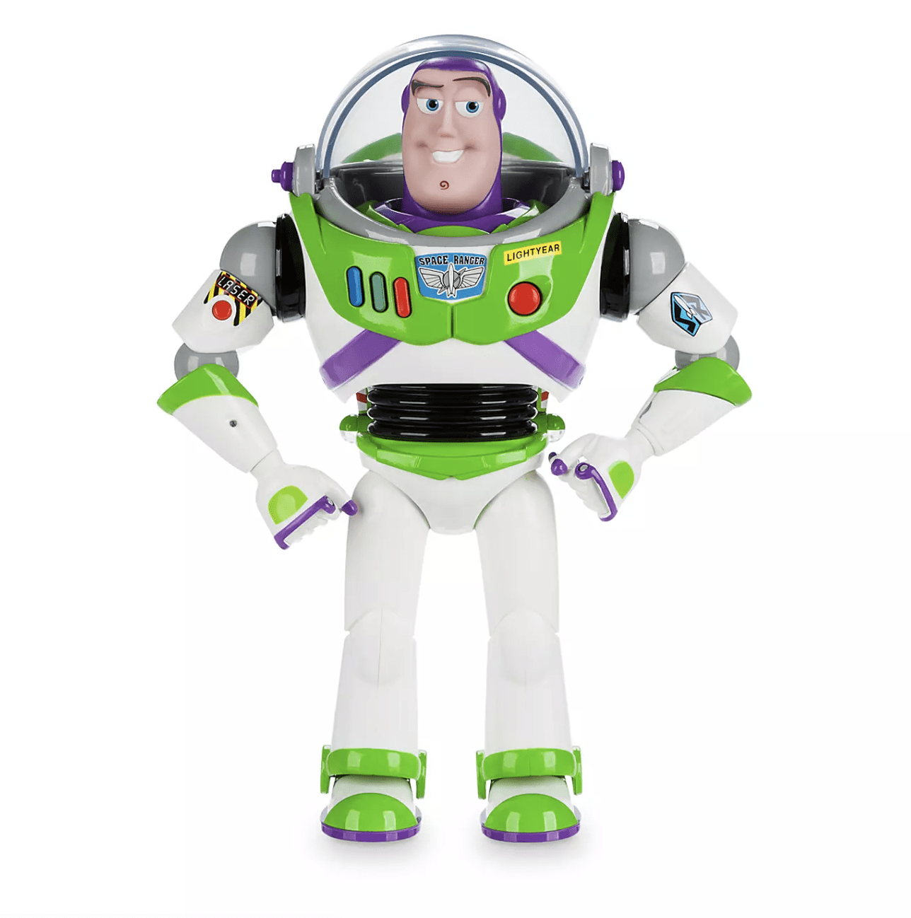 - Presione los botones azul, rojo y verde en el frente para escuchar más de 10 frases que incluyen «Este planeta es tóxico», «Perímetro de escaneo» y «Láser a máxima potencia».Presione el botón para liberar el ala y active las luces láser parpadeantes Presione el botón láser del brazo para obtener efectos de sonido y luz láser Pulsa el botón en las alas para activar el golpe de karate del brazo de Buzz Incluye una función interactiva, de modo que cuando Buzz detecta otras figuras de acción interactivas de Toy Story * cercanas, activa frases de Buzz ** Interactuar con otros personajes desbloquea una frase especial de Buzz ** Pulsador para retraer el casco Las puntas de las alas, la carcasa de las alas y la muñeca se iluminan Totalmente articulado con muchas articulaciones articuladas