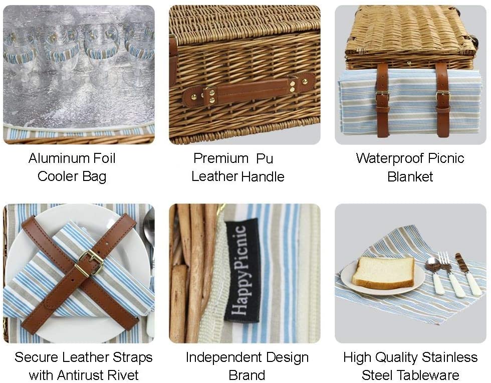 - 4 platos de melamina de 7.0 in, 4 copas de vino PS, 4 servilletas de algodón a juego. Una manta de picnic extra de 58.2 x 47.0 in.
