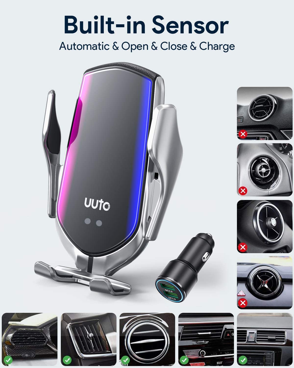 - Lo que obtienes: 1 cargador de coche inalámbrico; 1 adaptador de cargador de coche QC 3.0; 1 clip de ventilación de aire; 1 cable tipo C; 1 manual de usuario (idioma español no garantizado). Proporcionamos 12 meses sin preocupaciones reembolso completo o reemplazo, servicio de atención al cliente amigable con respuesta de 24 horas. Por favor, póngase en contacto con nosotros primero antes de compartir si tiene cualquier problema de calidad.
