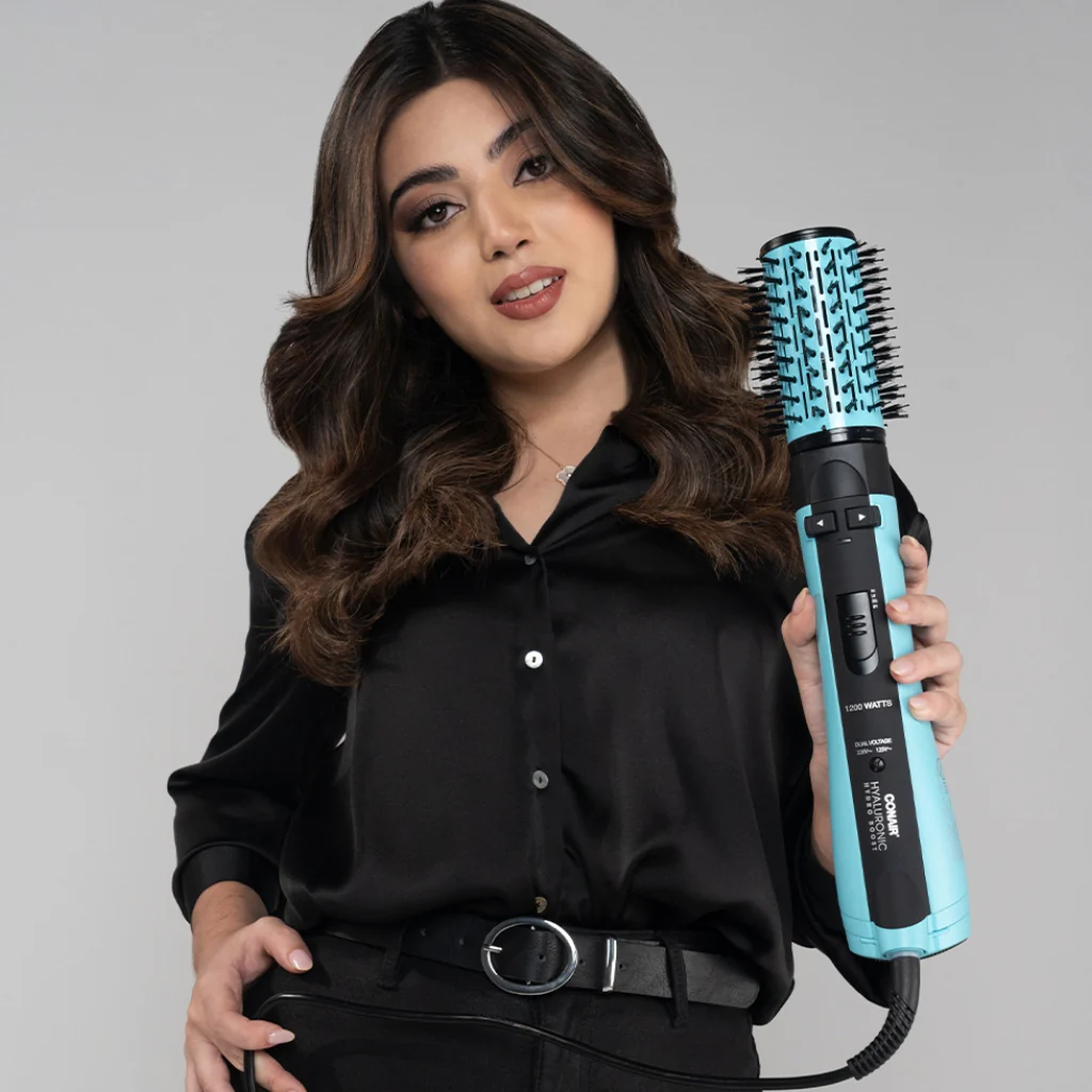 - Cilindro con cerámica e infusión en polvo de ácido hialurónico y combinación de cerdas tipo púa de diferentes longitudes se deslizan suavemente sobre las hebras del cabello para un acabado con más brillo, suavidad y movimiento natural