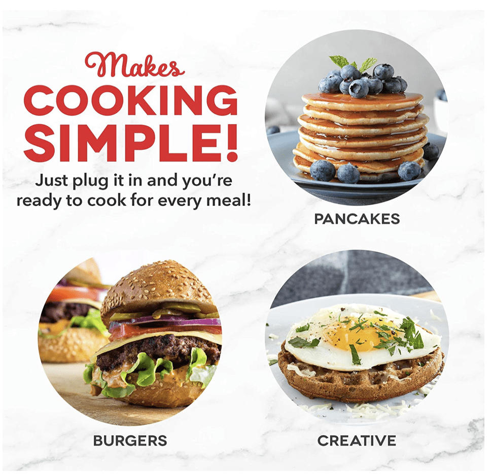 - Más que pancakes: haz porciones individuales para huevos, galletas, panqueques, queso a la parrilla sin la necesidad de múltiples ollas/sartenes