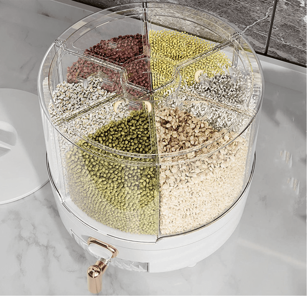 Dispensador de arroz, dispensador giratorio de alimentos secos, contenedor de almacenamiento de granos de cocina de plástico PP con 6 compartimentos para arroz y frijoles (blanco)