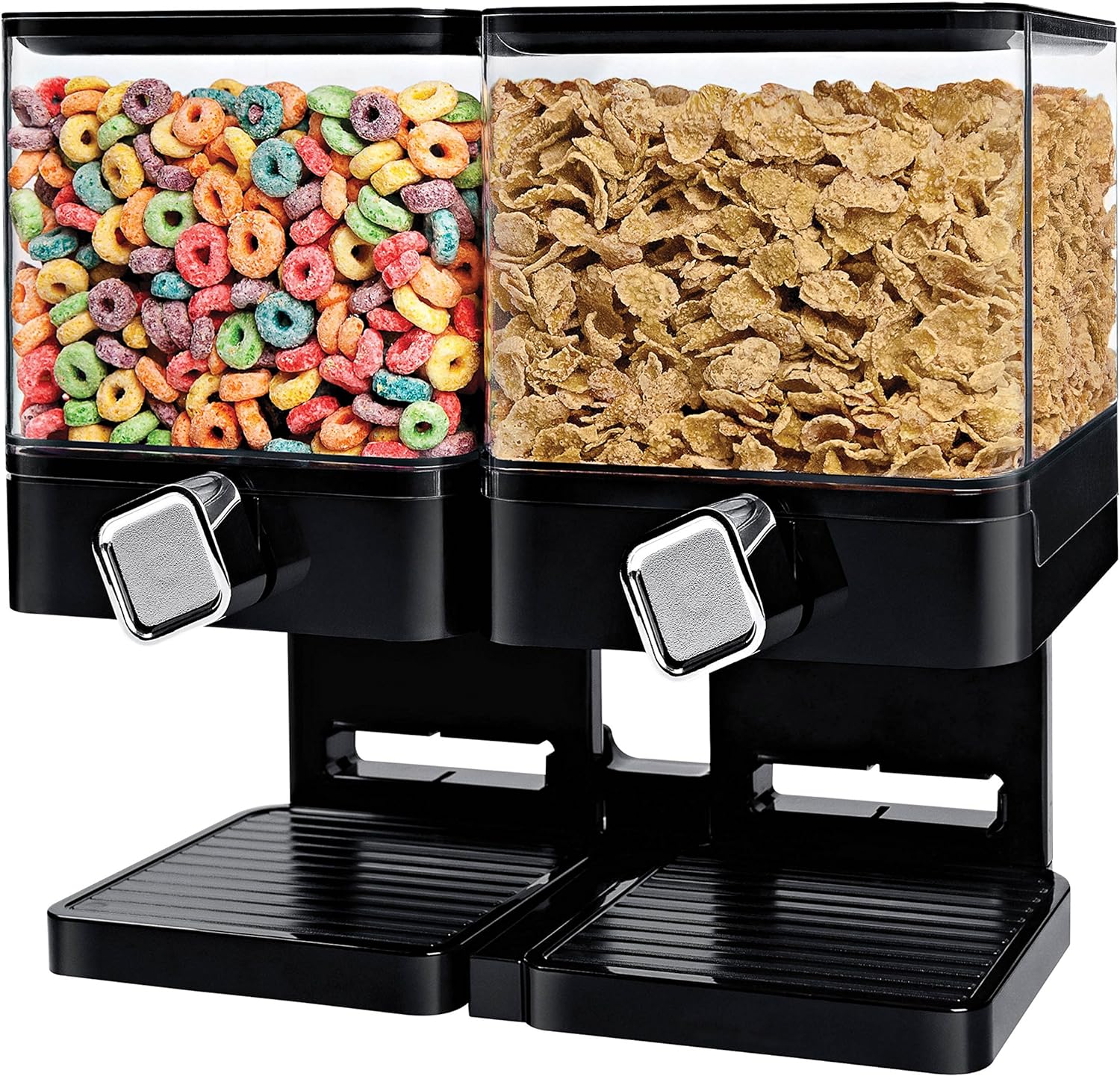 Cuando el espacio es limitado, el dispensador compacto de control de doble porción es un ajuste perfecto. Cada recipiente contiene eficientemente 17.5 onzas de alimentos secos, pero solo mide aproximadamente un pie de alto, por lo que cabe en muchos lugares cercanos. Es adecuado para una amplia variedad de alimentos secos como cereales, mezclas de frutos secos, dulces, granola a nueces, frijoles, arroz, etc. La dispensación según sea necesario mantiene los alimentos sanitarios y libres de gérmenes, mientras que su sello hermético ayuda a evitar que los alimentos se vuelvan rancios y conserva la frescura hasta 45 días, lo que significa que se desperdician menos alimentos. Este dispensador de alimentos es ideal para los padres, ya que promueve la creciente independencia a medida que los niños aprenden a servirse a sí mismos o para las personas que viven un estilo de vida saludable o consciente del peso. Para usar, simplemente coloque un recipiente debajo de la boquilla y gire la perilla. El sistema de control de porciones de la unidad utiliza una rueda de paletas suave y flexible que no aplasta los cereales, reduce los derrames desordenados y dispensa una cantidad medida con cada giro, aproximadamente una onza. Los niños disfrutarán girando la perilla y viendo cómo los cereales caen perfectamente en sus cuencos, y los padres pueden estar seguros de que los niños no derramarán cereales por toda la encimera de la cocina.