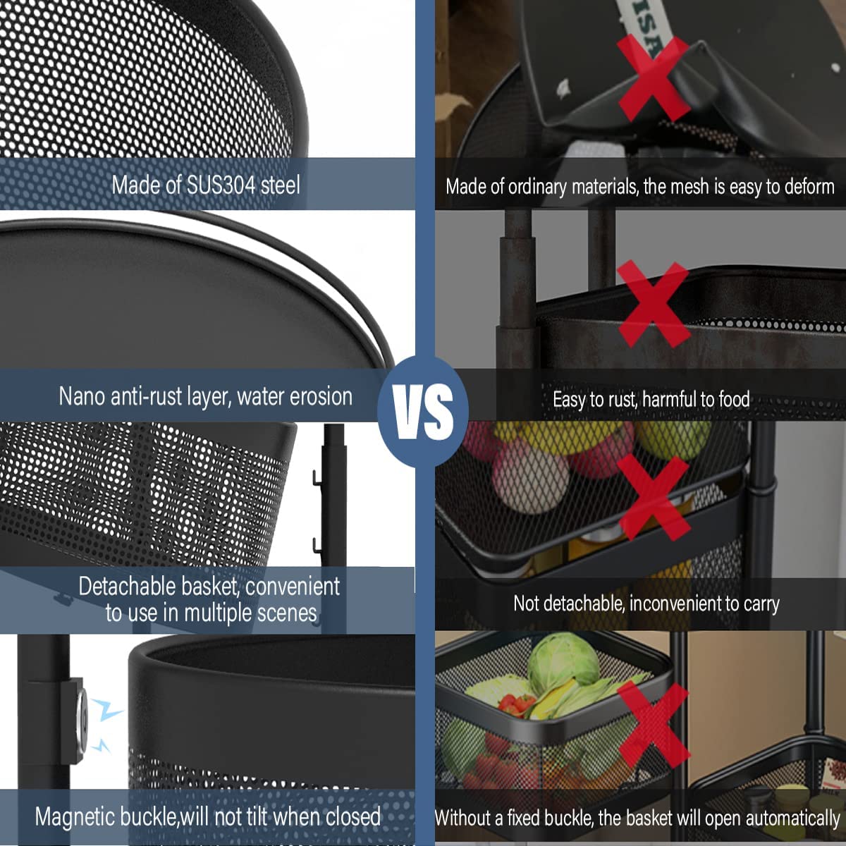 - 【Imprescindible para comprar cestas de frutas】Estante de almacenamiento giratorio, el carrito organizador está hecho de acero S304L (resistencia a la tracción de 510 ~ 660 MPa). El carrito de empuje es desmontable y se utiliza por separado. Ventajas de nuestros artículos para el hogar: se puede mover a la sala de estar de granja, los compradores pueden obtener el libro de cocina de freidora de aire gratis por un tiempo limitado