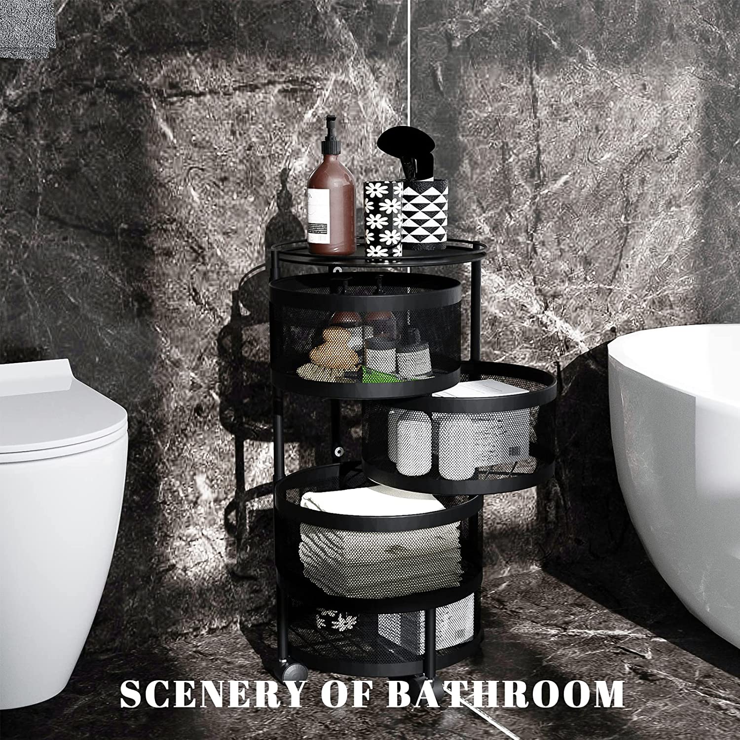 - Dimensiones del estante giratorio de la cesta de frutas: 13.38 pulgadas de diámetro, 35.43 pulgadas de altura, superficie galvanizada de acero inoxidable negro. Para almacenar/especias con especias/patata/cebolla/cuencos/aperitivo/kcup/casa de campo pequeña/toallas/y mucho más