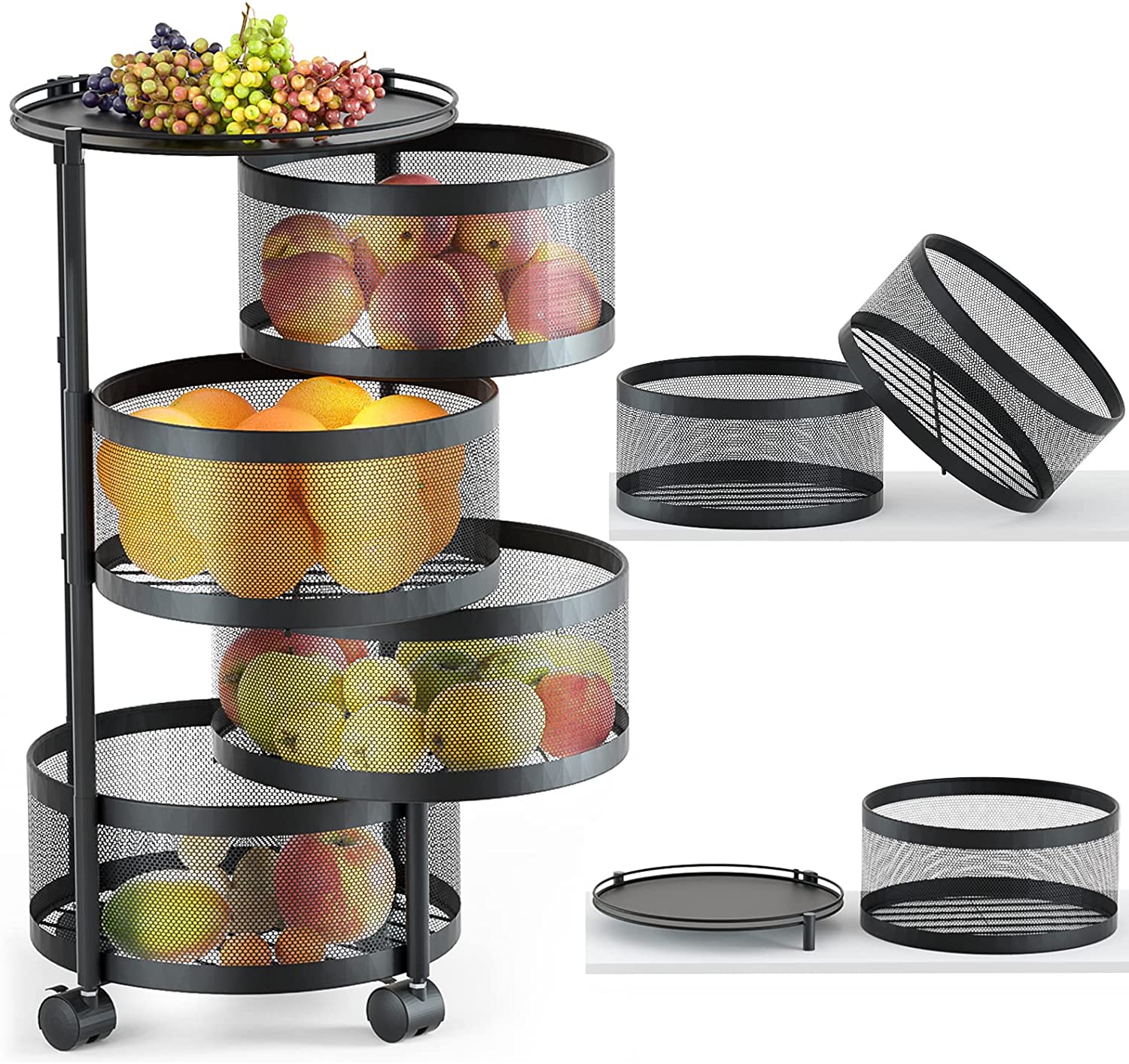 Estante de almacenamiento giratorio para cocina, cesta de frutas giratoria, estante de almacenamiento de cocina de frutas y verduras, cestas de almacenamiento de papas con ruedas, cesta de frutas de acero inoxidable material de metal (4+1 capa)