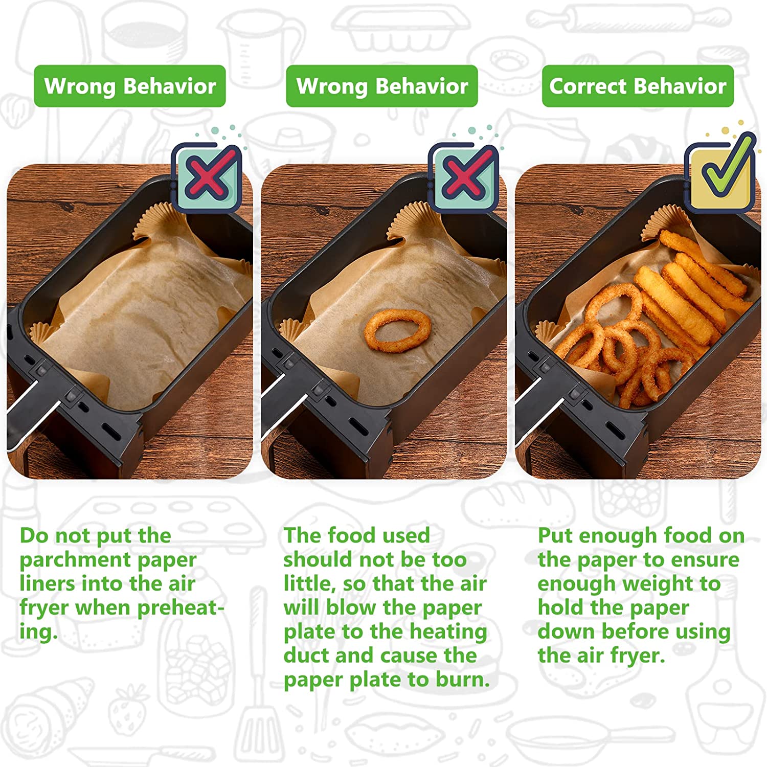 - ⚠️【Precauciones】 No pongas revestimientos de papel de pergamino vacíos cuando se precalienta, y no utilices demasiado poco comida para evitar revestimientos de papel desechables que no se pueden presionar debido a su peso ligero, y el aire caliente sopla los revestimientos de papel en el tubo de calor haciendo que la sartén de papel se queme.