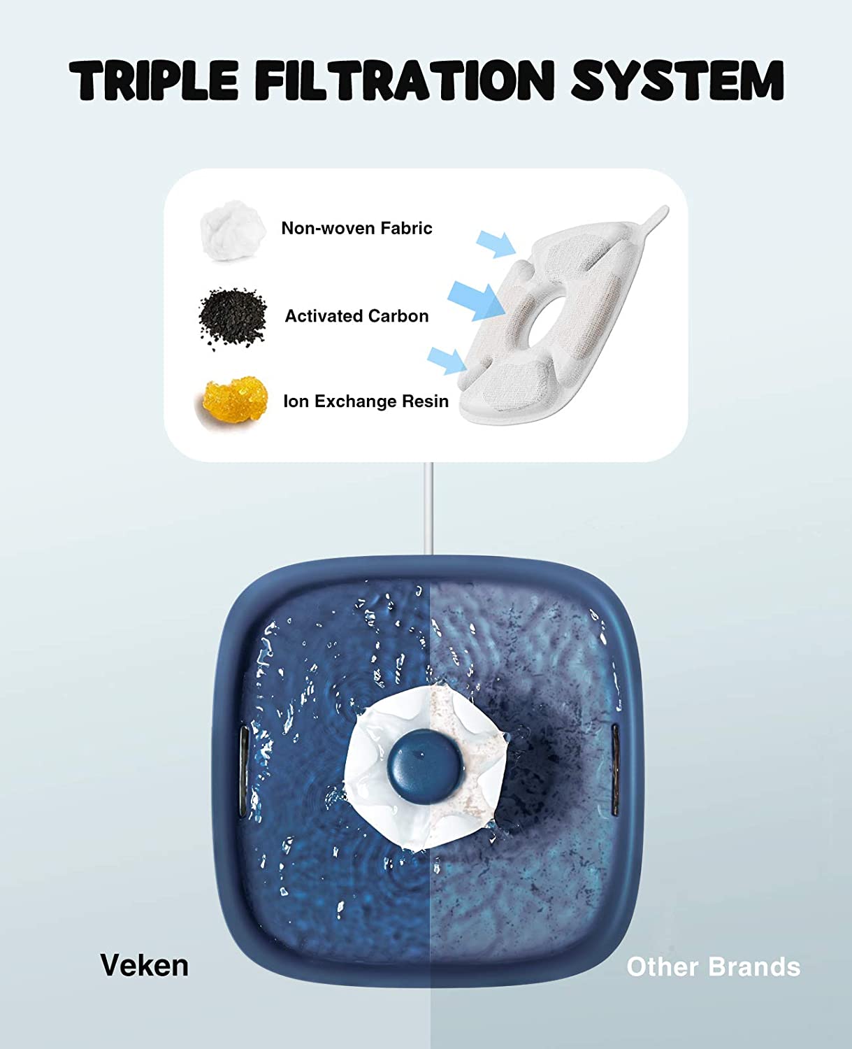 - Sistema de triple filtración: además de mantener el agua fresca a través de la circulación, el sistema de triple filtración, incluyendo capa de carbón activado, resina de intercambio de iones y tela gruesa no tejida, mantiene el agua mejor sabor y más segura para las mascotas.