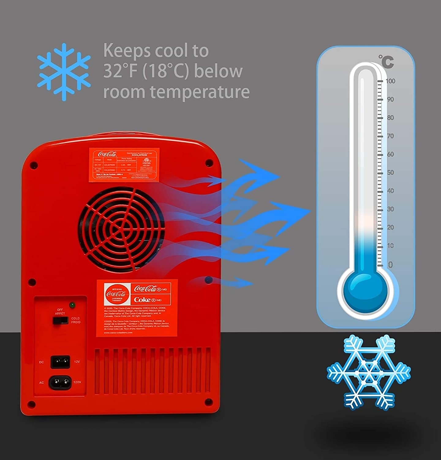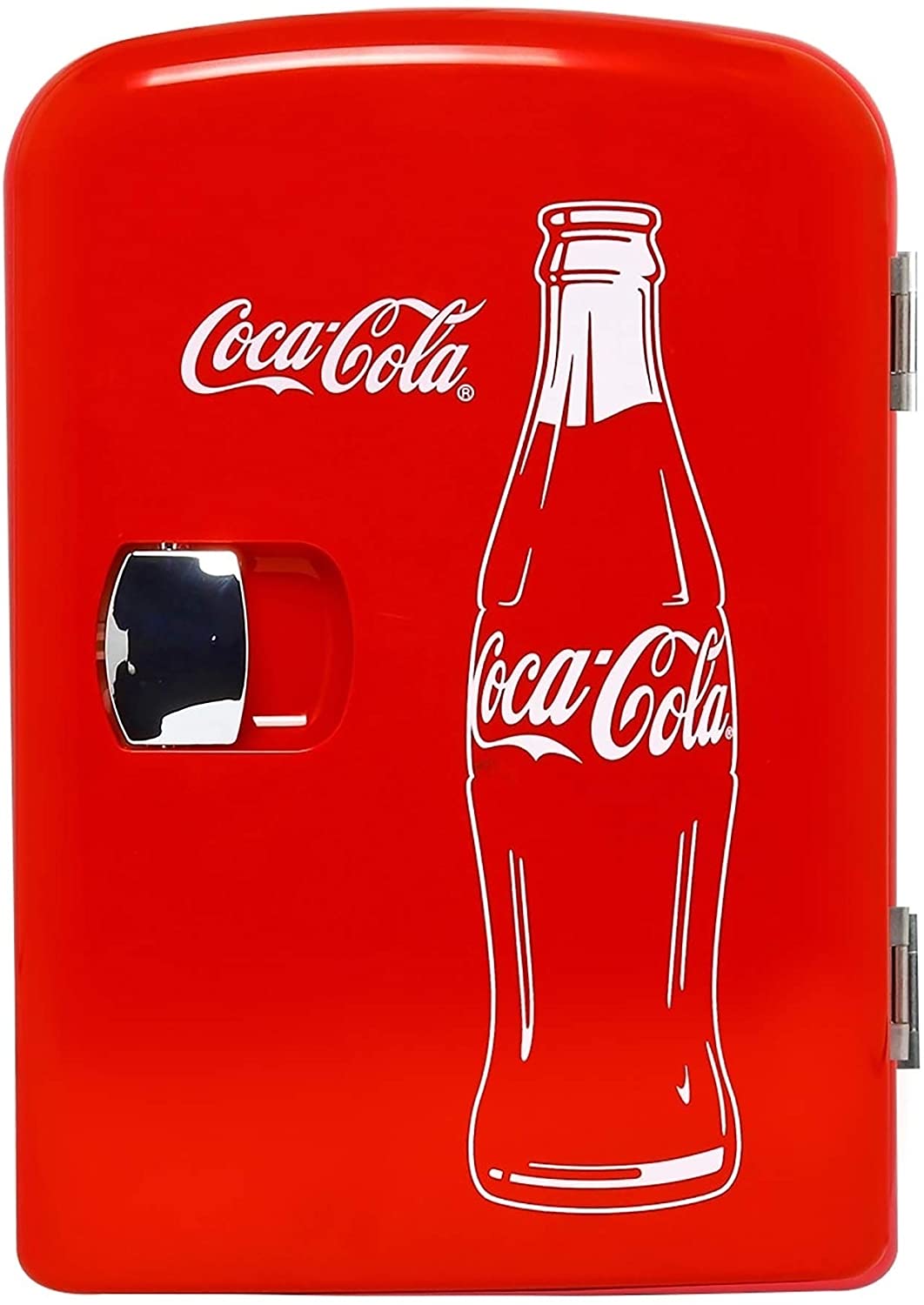 - Refrigerador portátil personal con diseño clásico de Coca-Cola. Enfriador de bebidas ideal para usar en casa o mientras estás en tu camión, lancha o caravana. Capacidad compacta de 4.2 cuartos de galón: este enfriador portátil puede contener hasta seis latas.