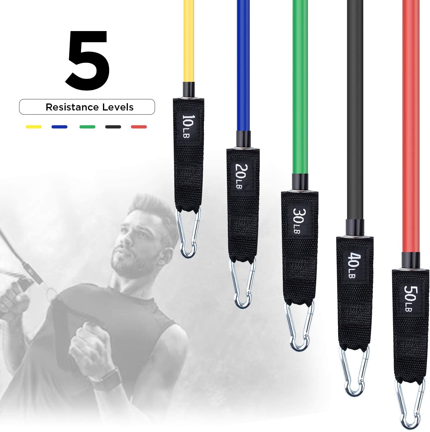 - 5 bandas de ejercicio de color: todas las bandas de ejercicio son de 41 pulgadas de longitud y vienen en amarillo (10 libras), azul (20 libras), verde (30 libras), negro (40 libras) y rojo (50 libras). Nuestras bandas de entrenamiento se pueden utilizar de forma independiente o en diferentes combinaciones, con una máxima resistencia.