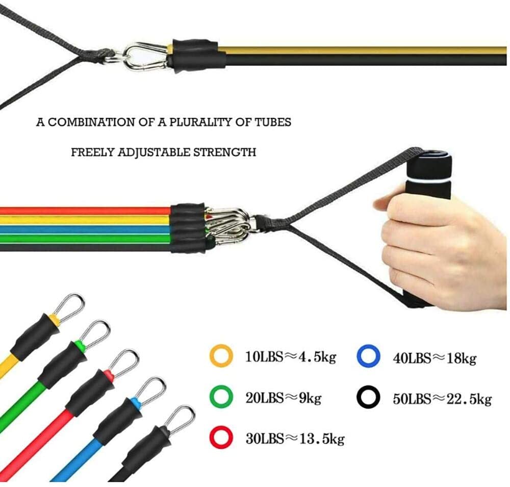 - Bandas de resistencia ajustables: amarillas de 10 a 15 libras. rojas de 15 a 20 libras. azules de 20 a 25 libras. verdes de 25 a 30 libras. negras de 30 a 40 libras. Todas las bandas de ejercicio se pueden utilizar solo apiladas en cualquier combinación a un equivalente máximo de 100 libras.