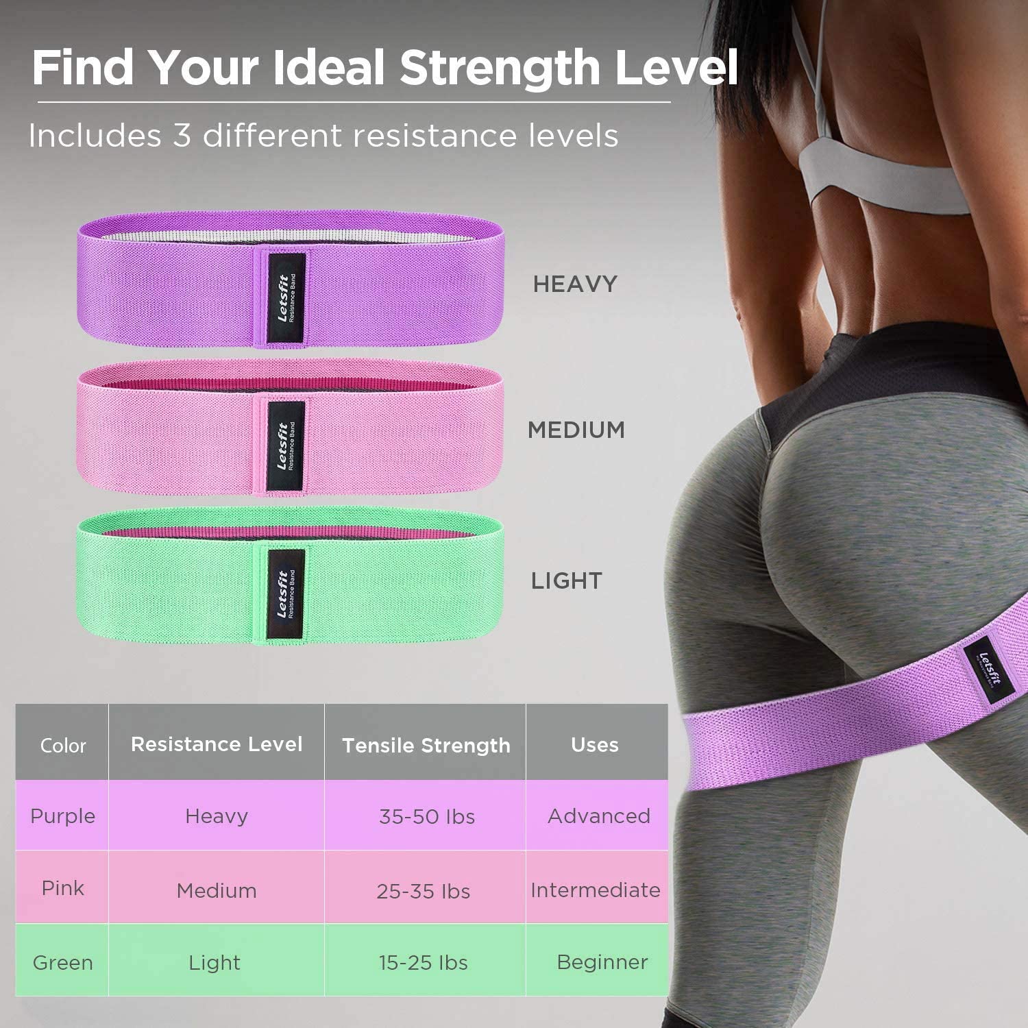 - Un conjunto para todos tus entrenamientos: el juego de bandas de entrenamiento de Letsfit viene en un paquete de 3 con diferentes niveles de resistencia, pesado (35-50 libras) en morado, mediano (25-35 libras) en rosa y ligero (15-25 libras) en verde. Siempre puedes tener la banda adecuada para tus diferentes intensidades de entrenamiento.