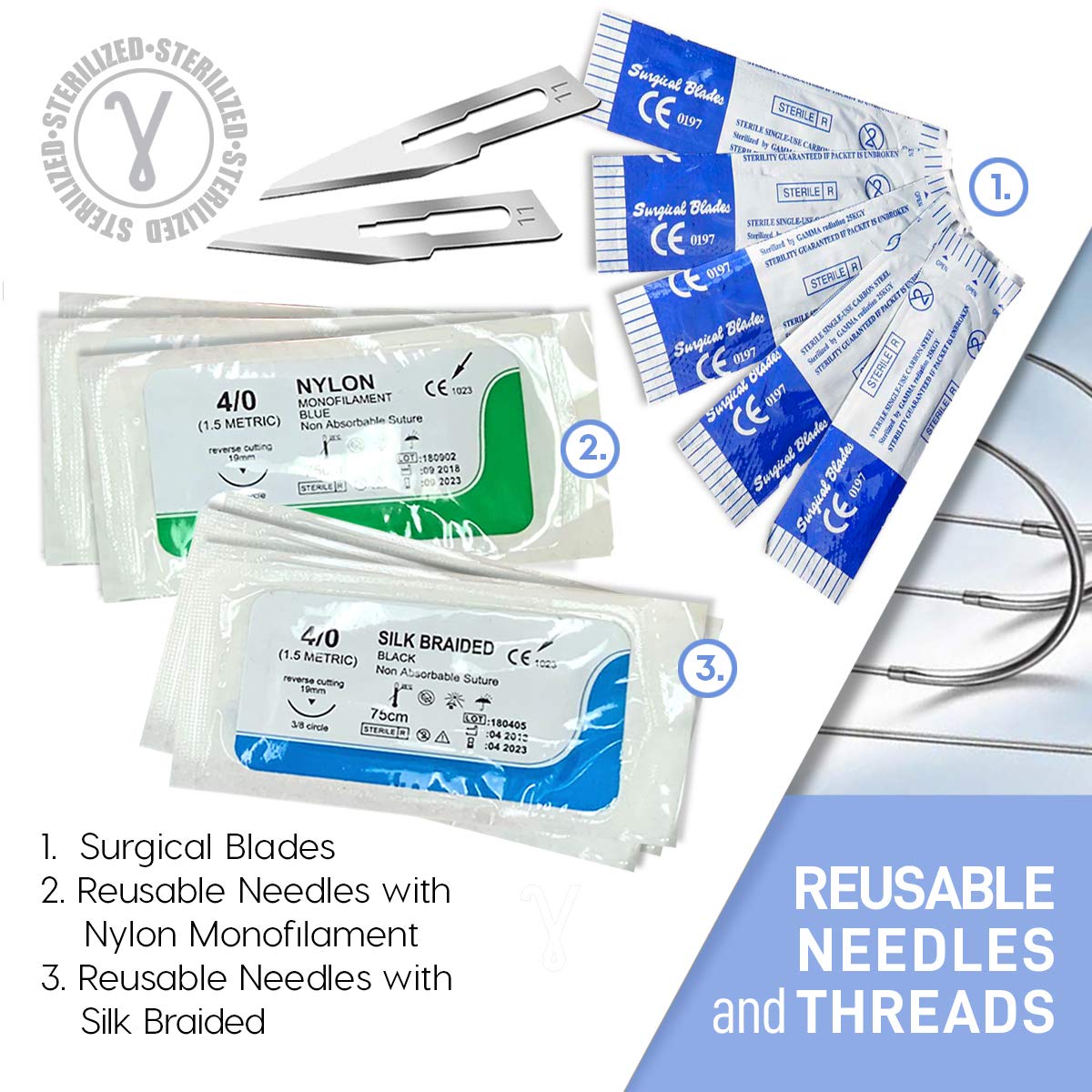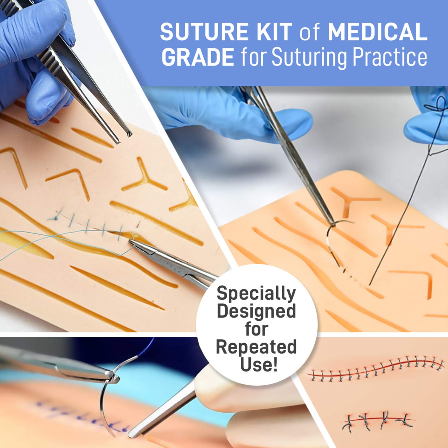 KIT completo practica saturación Medical para estudiantes – Reusable Skin Simulation Silicon PAD 4th GEN with PRE-Cut Wounds, Full Set of Essentials Stainless Still SUTURING Tools