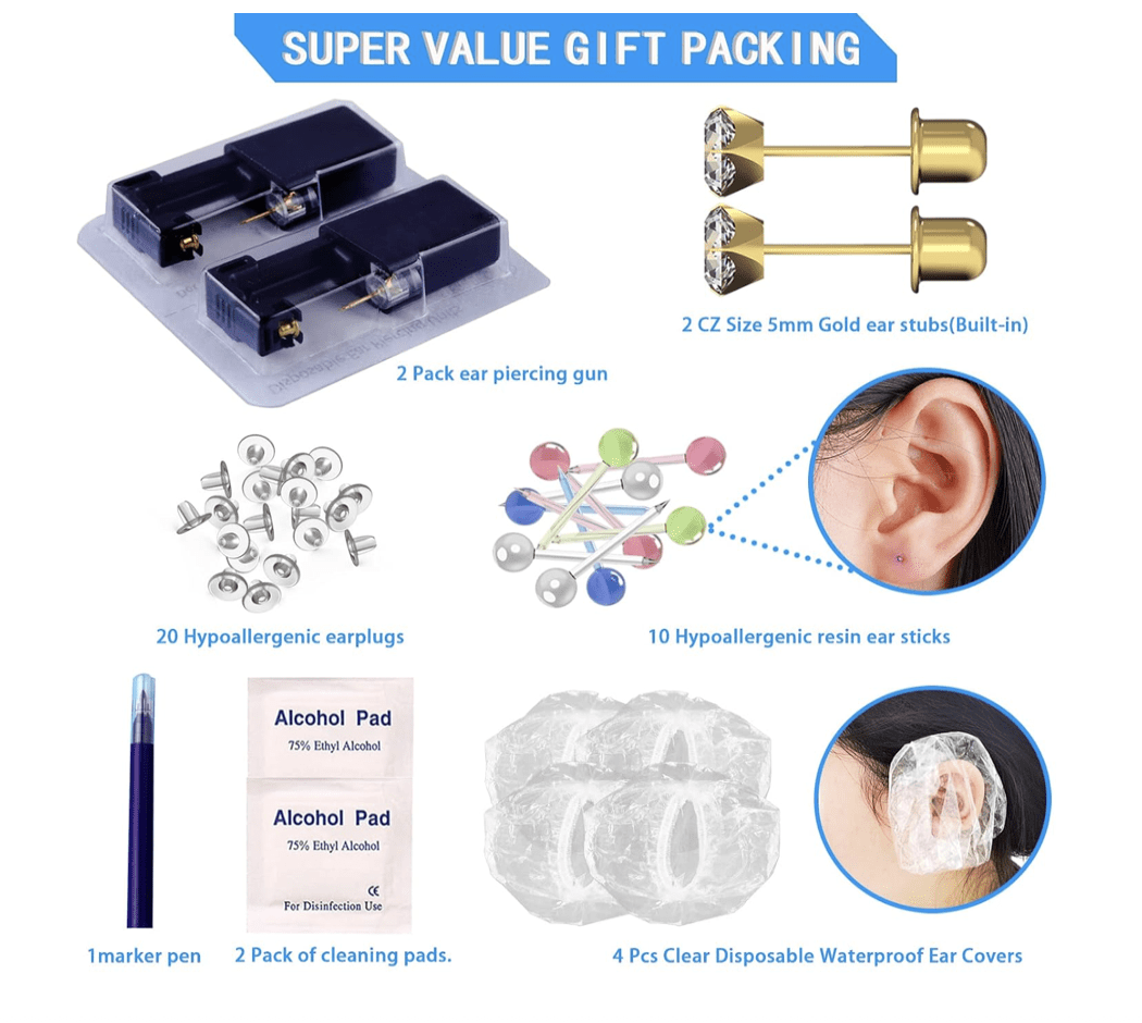 - Un paquete contiene todo: recibirás 2 pistolas de perforación de oreja, (oro de 0.197 in de tamaño ZZ) ya integrados en la pistola de perforación, 2 paquetes de almohadillas de limpieza. 4 fundas transparentes desechables impermeables para las orejas, 10 varillas de resina hipoalergénica, 20 tapones hipoalergénicos para los oídos. También te ofrecemos un marcador de piel, con este bolígrafo puedes perforar exactamente donde quieras.