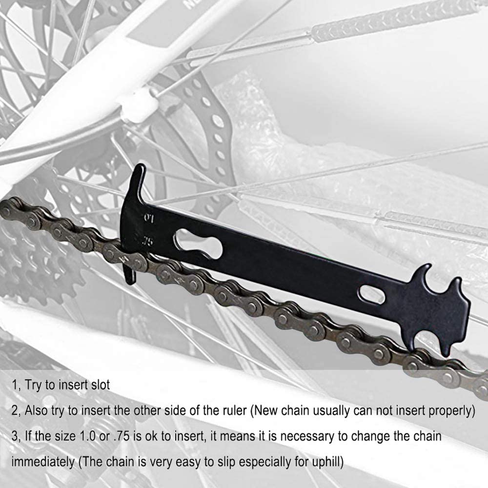 - Indicador de desgaste para bicicleta: medición rápida y fácil del desgaste, hecho de acero endurecido, dos pantallas de precisión de 0,75 y 1,0, 0,75 es el límite de desgaste oficial para el uso de la cadena, 1,0 para uso con piñones de acero.