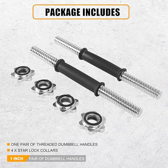 - Mango de mancuernas: las barras de mancuernas roscadas de 14 pulgadas de largo están hechas de acero resistente, cromado y resistente al óxido, se adaptan a todos los ajustes estándar de placas de agujero de 1 pulgada, ideal para todo tipo de ejercicios con mancuernas