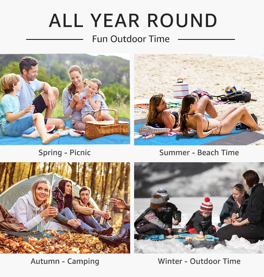 - Alfombrilla grande para exteriores pero compacta y ligera: la manta portátil para exteriores es de 8.9 x 6.9 ft para adaptarse a 4 – 7 personas. Y se pliega a un tamaño compacto (5.3 x 7.9 in) que cabe en una bolsa para hacer un gran y ligero transporte. También es una práctica manta en caso de mal tiempo donde necesitas algo de protección adicional para cubrir.