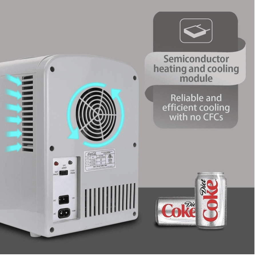 Mini refrigerador Coca-Cola Diet Coke – Enfriador/calentador portátil de 4 litros, refrigerador de viaje personal compacto para aperitivos, almuerzo, bebidas, cosméticos, incluye cables de 12 V y CA, accesorio de escritorio para el hogar, oficina, dormitorio, viajes, gris