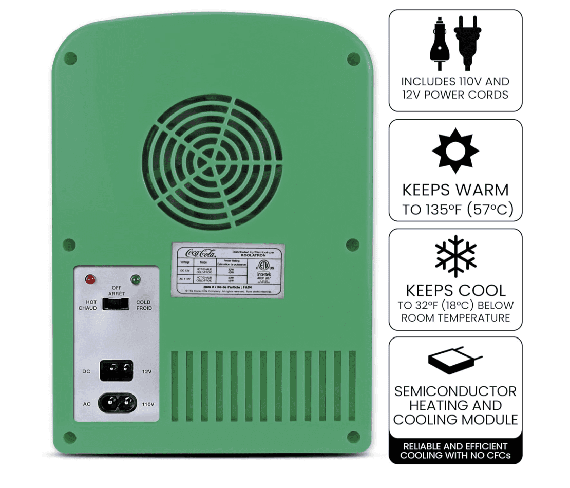 - Refrigeración y calentamiento ecológicos: la tecnología termoeléctrica sin CFC mantiene eficazmente los artículos frescos a 32°F (64.4 °F) por debajo de la temperatura ambiente o cambia a modo caliente para mantener los artículos calientes hasta 135°F (134.6 °F)