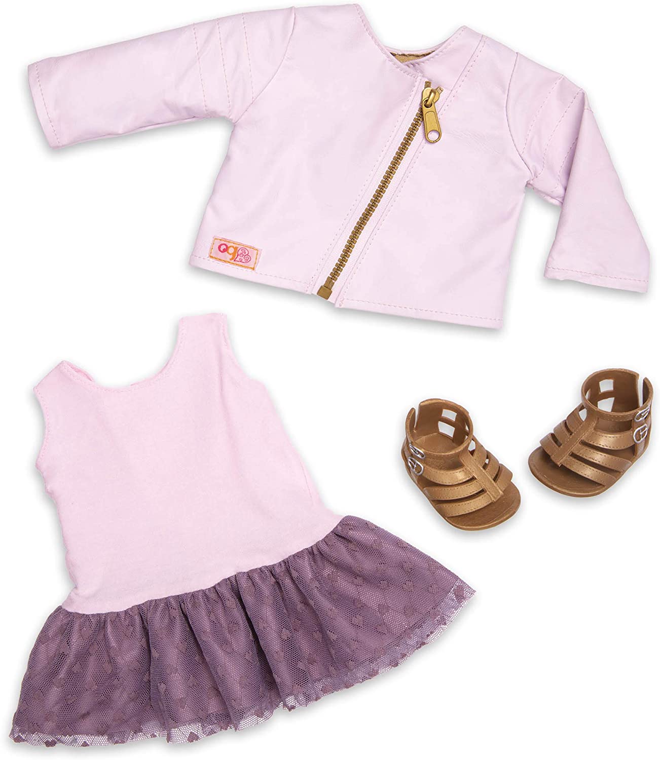 Muñeca Viena Our Generation 18 inch Regular Doll Viena con largo café Cabello, Brown Eyes, Rosa cierre chamarra, púrpura de volantes falda y sandalias.