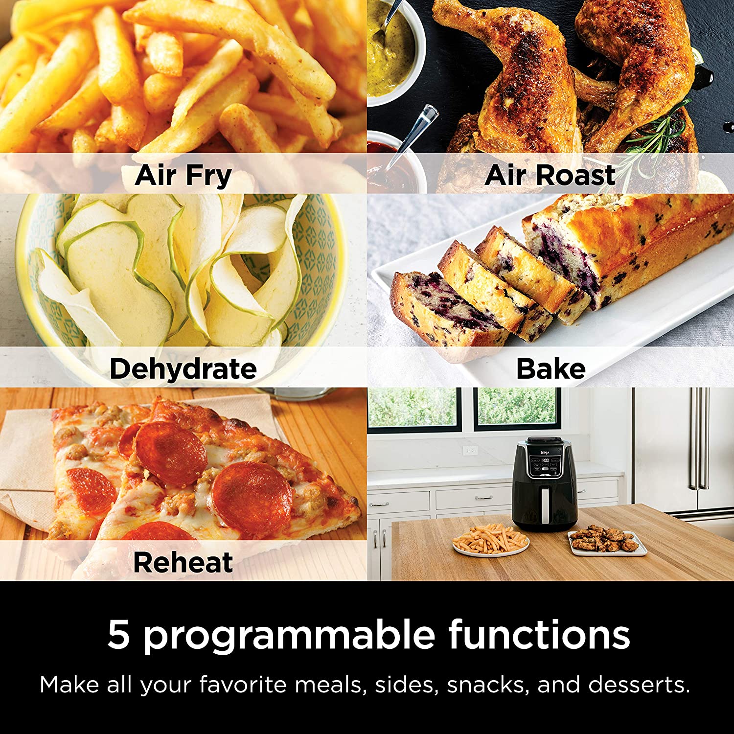 - Funcionalidad versátil 5 en 1: incluye 5 programas de cocción versátiles: freír al aire, asar al aire, hornear, recalentar y deshidratar.