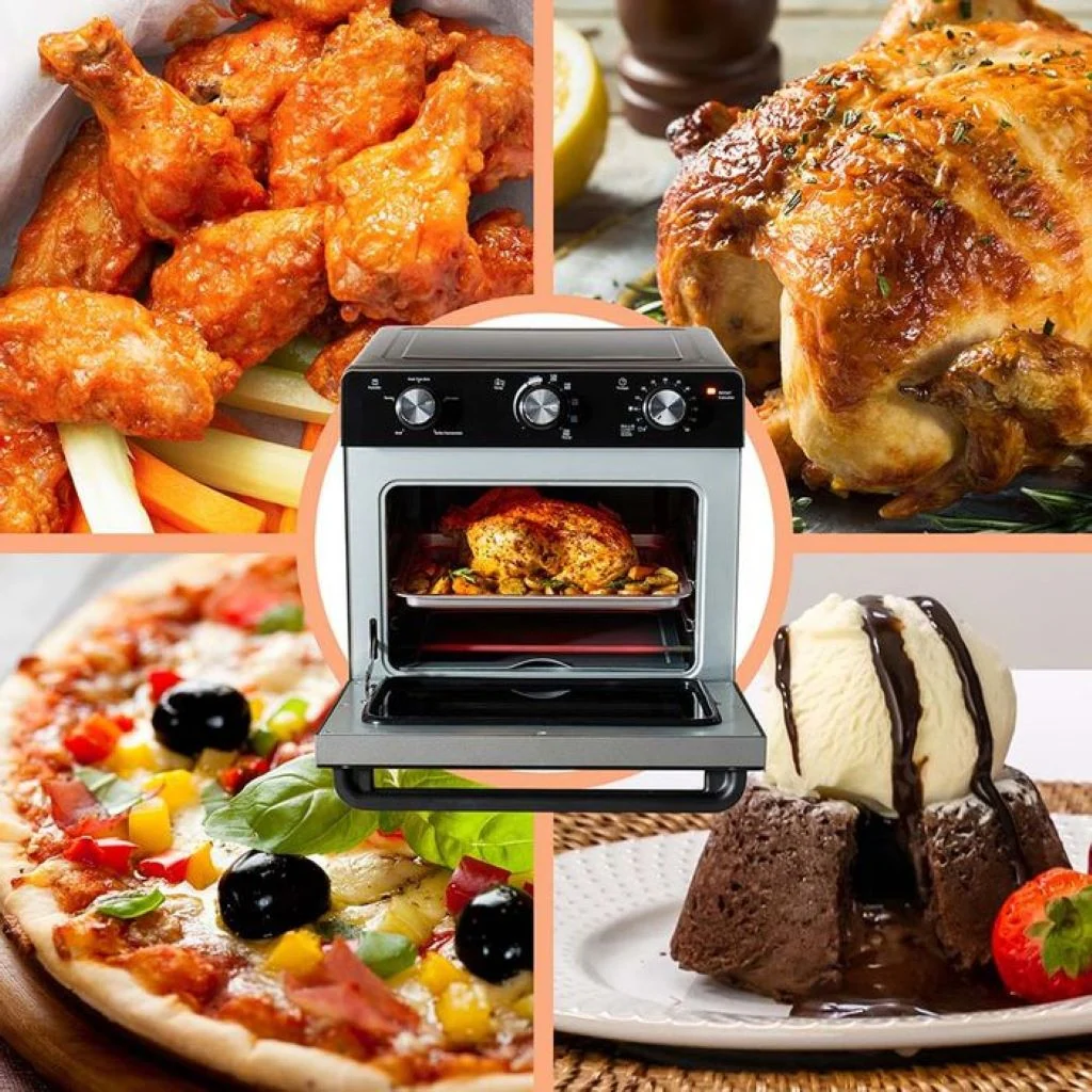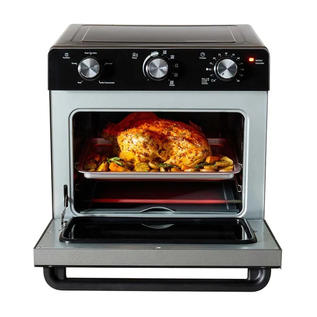- 5 funciones: freír con aire, hornear, tostar, asar, y turbo convección