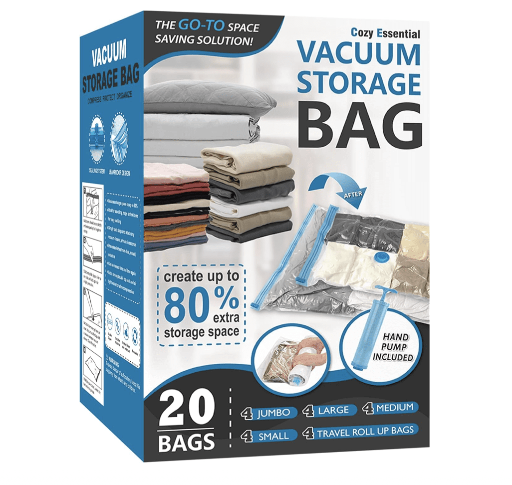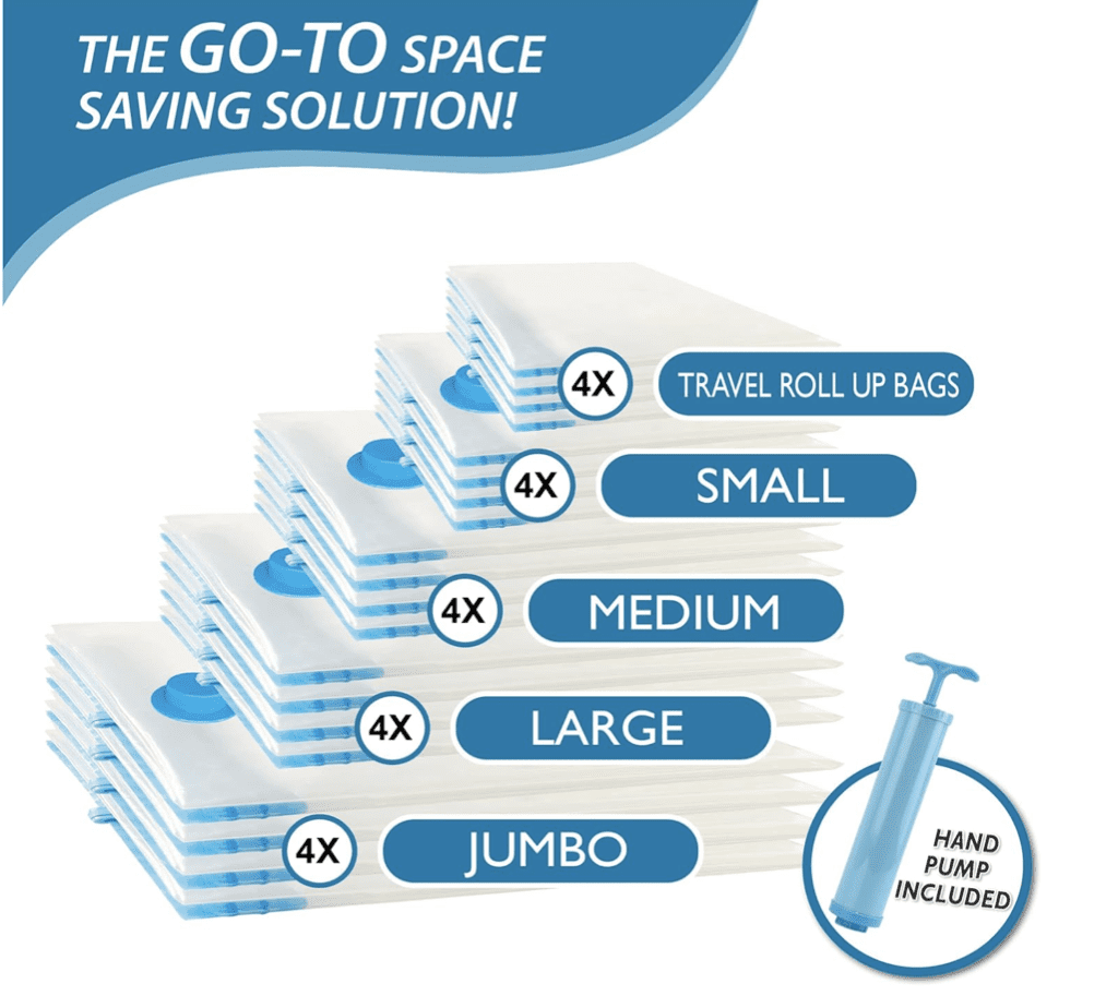 Paquete de 20 bolsas de almacenamiento al vacío, bolsas ahorradoras de espacio (4 jumbo, 4 grandes, 4 medianas, 4 pequeñas y 4 para enrollar) bolsas de almacenamiento de compresión para edredones y mantas, bolsas selladoras al vacío para almacenamiento de ropa, bomba de mano incluida