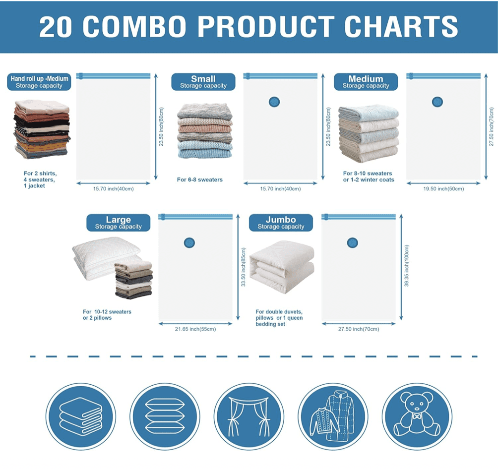 - El paquete de 20 incluye: 4 Jumbo: 39.35″ X 27.5″(39.4 in X 27.6 in); 4 Grandes: 33.5″ X 21.65″(33.5 in X 21.7 in); 4 M: 27.5″ X 19.5″(27.6 in X 19.7 in); 4 Pequeños: 23.5″ X 15.7″ (23.6 in X 19.5″) 15.7 in); 4 Rollo de viaje (no necesita agujeros de vacío): 23.6 in x 15.7 in