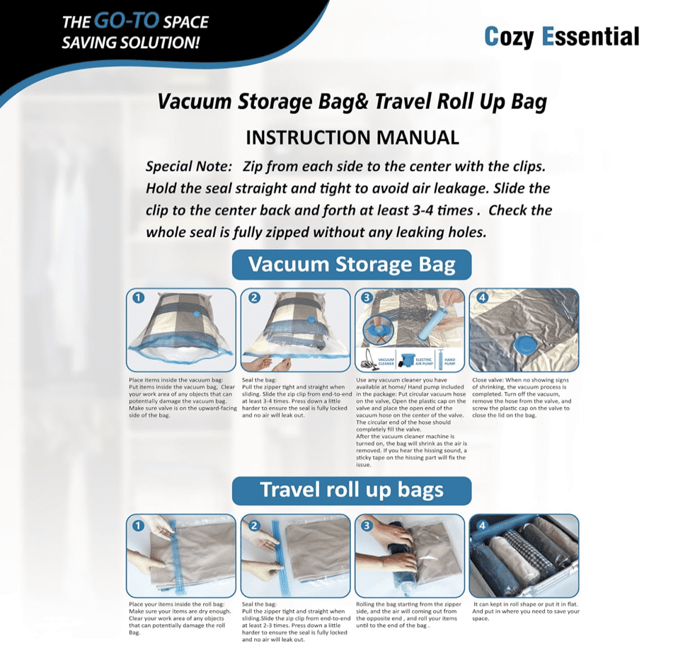 - Multiusos: nuestras bolsas de almacenamiento al vacío son esenciales tanto para ahorrar espacio en el hogar como para organizar viajes. Funciona como bolsas de almacenamiento para ropa y bolsas de compresión para viajes.