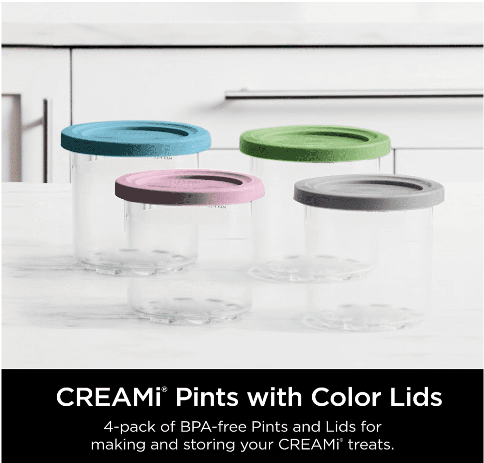 - Contenido del paquete: (4) 16 onzas. Pintas CREAMi, (4) tapas de almacenamiento en lima, aguamarina, rosa y gris, y libro de instrucciones (idioma español no garantizado).