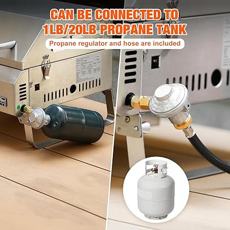 - OPCIONAL PARA CILINDRO DE GAS PROPANO DE 1LB O 20LB: La válvula de gas y la manguera están incluidas tanto para un cilindro de propano de 1 libra como para un tanque de propano de 20 libras. Fácil conexión con el gas y comienza a cocinar tu barbacoa. La bandeja de grasa extraíble recoge los goteos de alimentos y aceite para una fácil eliminación.