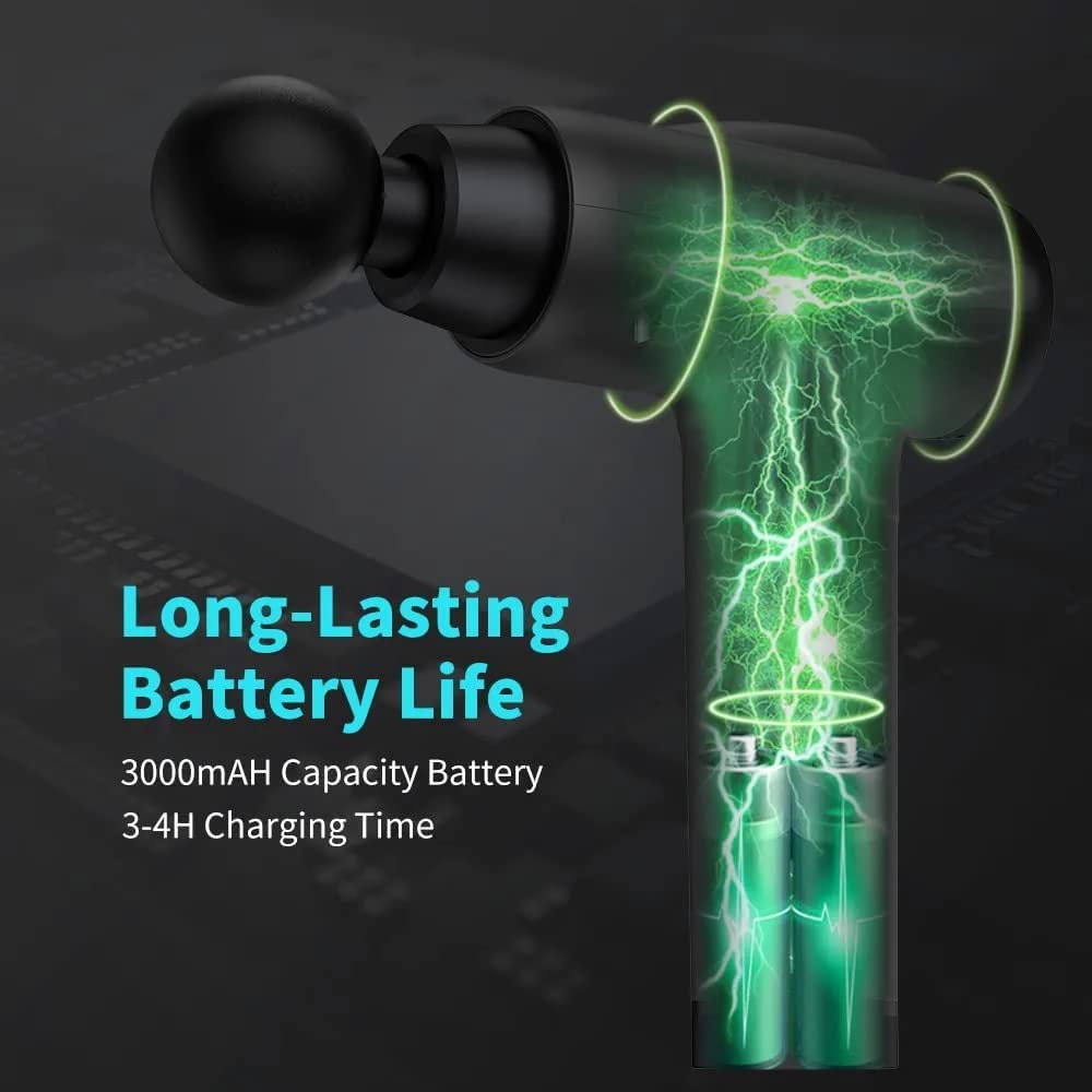 - Batería recargable y pantalla LED inteligente: alimentado por una batería recargable, nuestra pistola masajeadora muscular profunda funciona durante varias horas rectas. La pantalla integrada muestra la velocidad y el porcentaje de la batería, por lo que siempre sabes cuándo cargar.