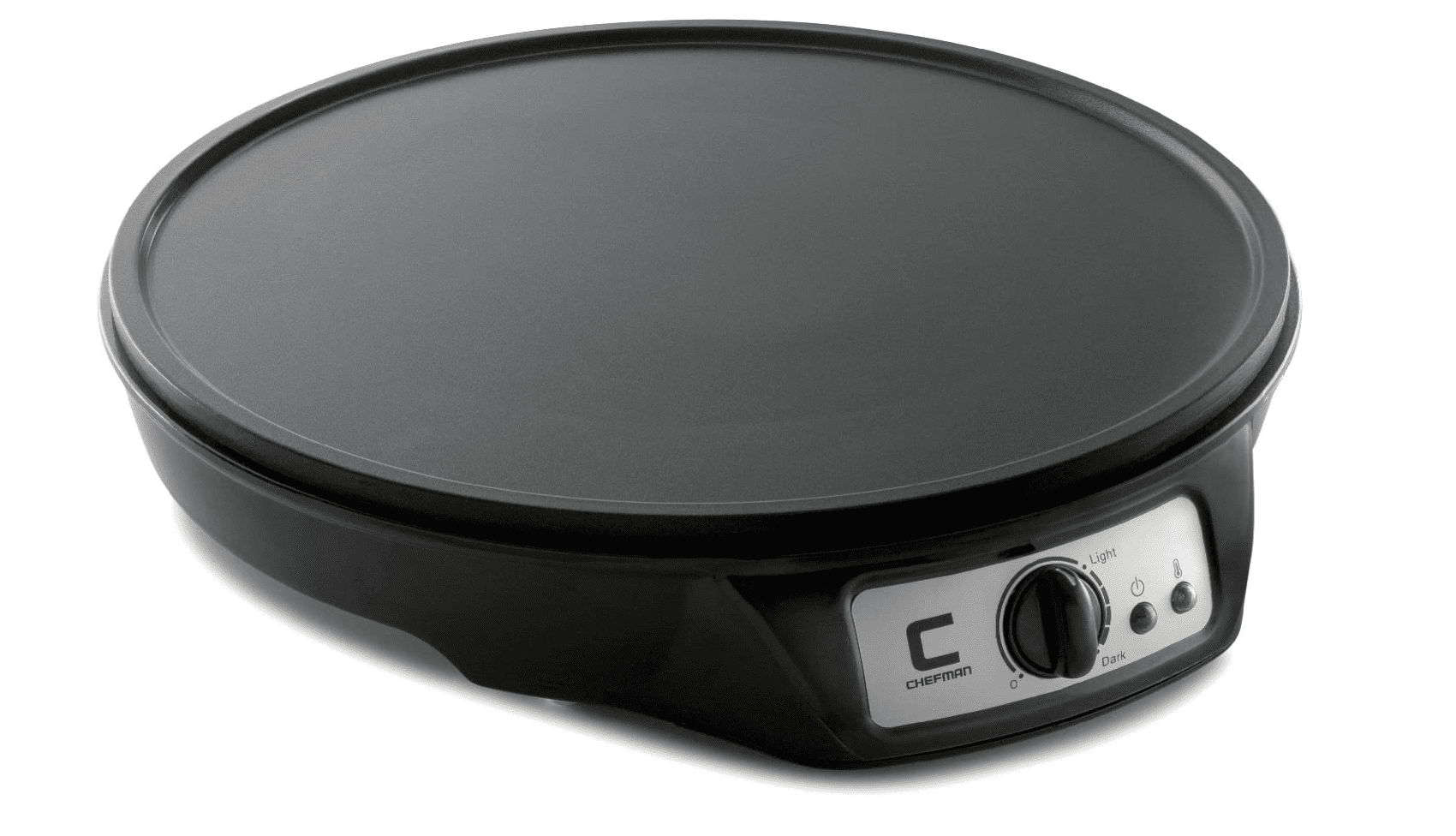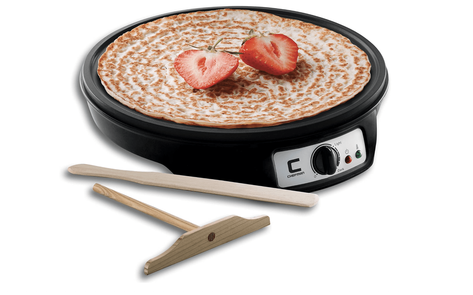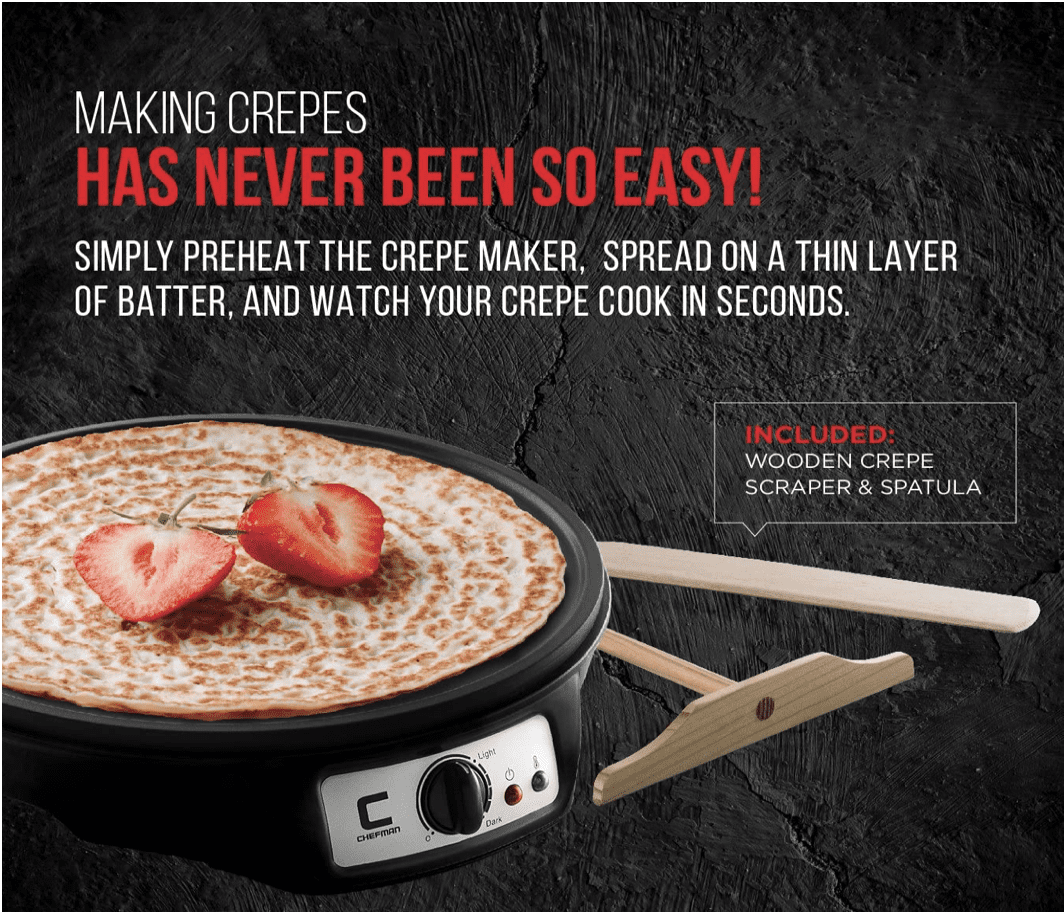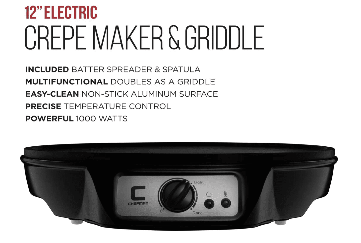- calidad de cafetería justo en casa. Con la máquina eléctrica de crepé Chefman puedes hacer crepes, blintzes, panqueques, tortillas, hash browns y muchos más favoritos del desayuno. Esta sartén multifuncional para crepé también funciona como plancha, por lo que se puede utilizar de día o de noche. El desayuno, el almuerzo, el almuerzo o la cena será más fácil y divertido que nunca.