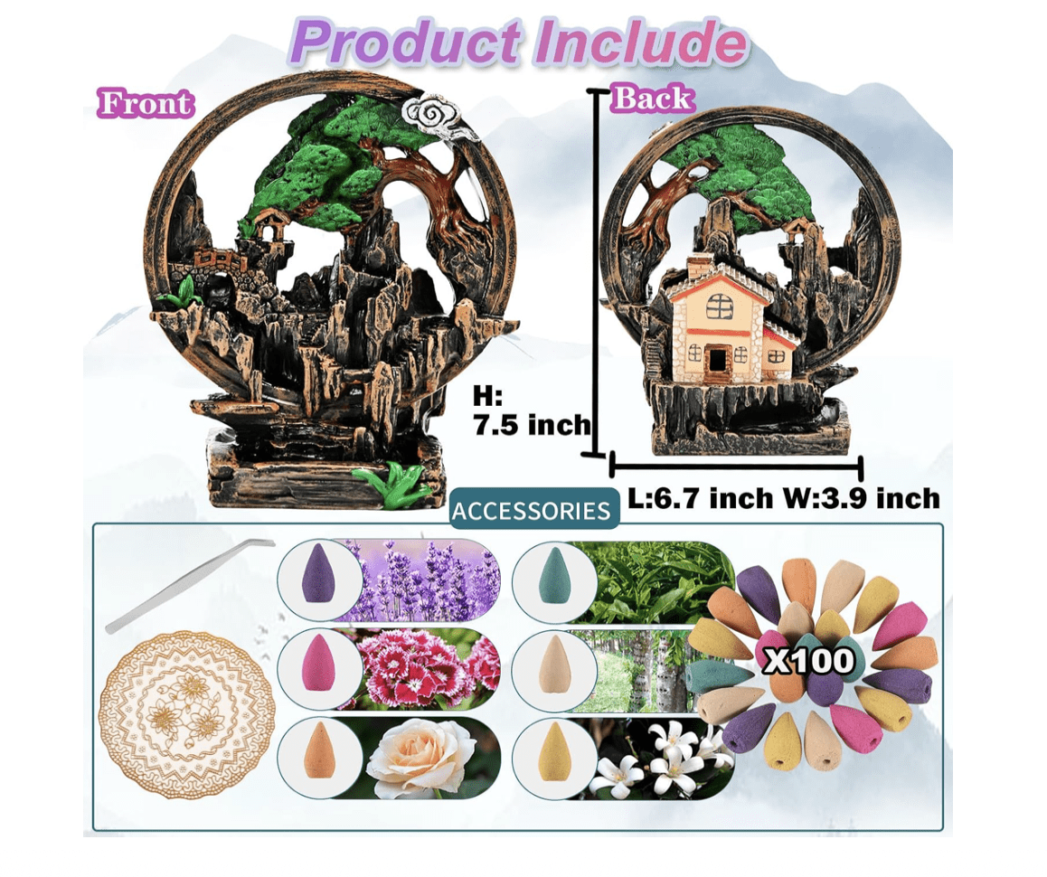 - ❤【Los productos incluyen】: este quemador de incienso en cascada mide: 7.5 x 6.7 x 3.9 pulgadas. Hecho de materiales de alta calidad gruesos y robustos, viene con 100 conos de incienso, pinzas, almohadillas. No es necesario comprar ningún producto para disfrutar de un hermoso espectáculo de humo.
