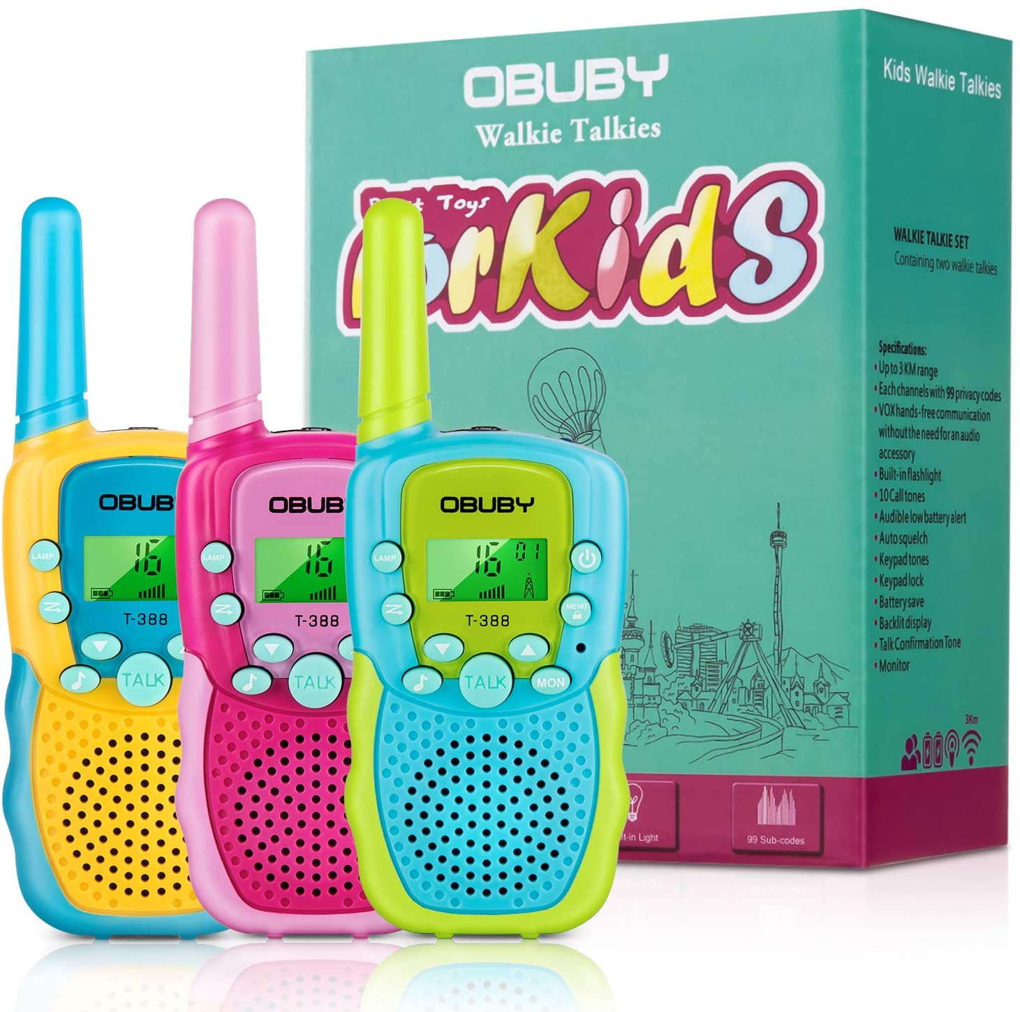 Radios de comunicación para niños Obuby , 22 canales de radio de 2 vías juguete para niños de 4.8 Kilometros de largo alcance con linterna LCD retroiluminada, camping, senderismo, 3 unidades, Azul, rosa y amarillo.