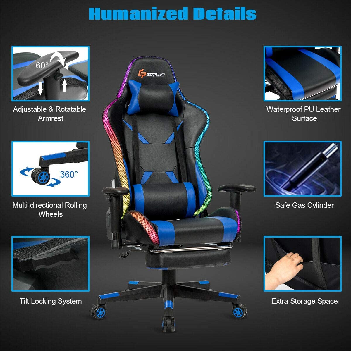 Silla Gamer – Goplus Silla de masaje para juegos con luz RGB, respaldo reclinable, pasamanos y ajuste de altura del asiento, silla de oficina con reposapiés, silla ergonómica de PU giratoria de respaldo alto