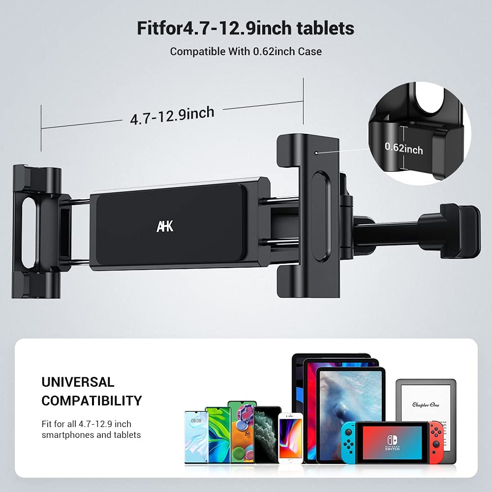 Soporte para tableta de coche, soporte para reposacabezas para tableta, soporte para reposacabezas AHK, compatible con dispositivos como iPad Pro Air Mini, Galaxy Tabs, otros teléfonos celulares y tabletas de 4.7 a 12.9 pulgadas