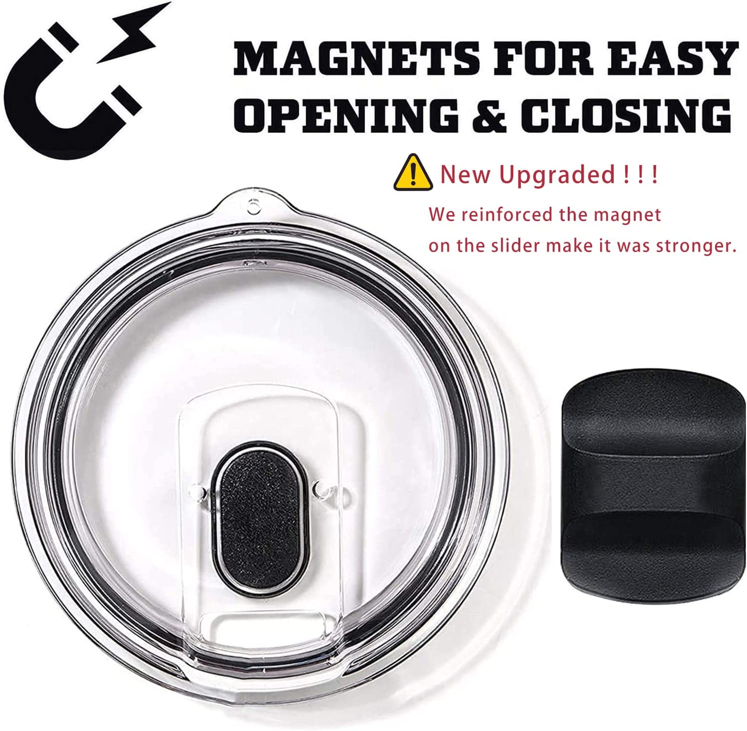 - Deslizador magnético seguro y práctico: nuevo mejorado. ! ! Hemos reforzado el imán en el deslizador para que sea más fuerte. Deslizador magnético suave para abrir y cerrar, agujeros para beber directamente o usar pajita. No tocará la nariz al beber. El deslizador se puede quitar, fácil de lavar. Disfruta de tu bebida caliente o fría favorita