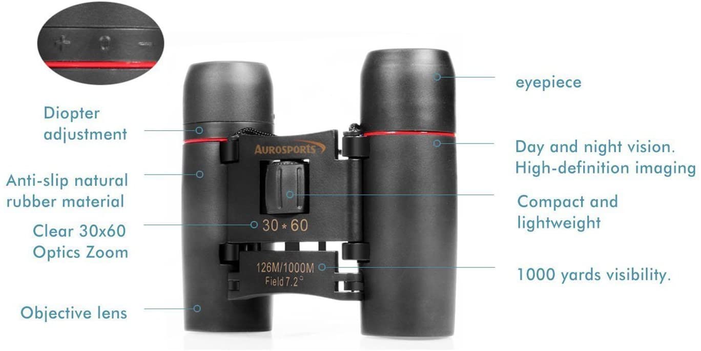 • Ampliación: 30×60, campo de visión: 7.2 grados, 126M / 1000M, 7.2 grados. Tamaño plegado: 9 x 6 x 4 cm Tamaño abierto: 9 x 10 x 4 cm; De color negro.