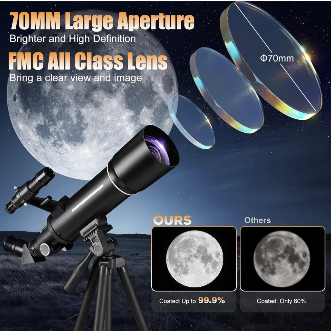 - Gran apertura mejorada de 2.756 in: el telescopio AKLIFFE cuenta con una apertura de 2.756 in, una distancia focal de 15.748 in y lentes de vidrio óptico totalmente recubiertas. La gran apertura captura más luz, mientras que el revestimiento FMC multicapa de banda ancha de alta transmisión y resistente a los arañazos reduce los reflejos para proporcionar una visión clara y realista y una representación precisa del color. Ya sea que esté explorando paisajes lunares cautivadores o paisajes naturales impresionantes, ofrece una excelente experiencia visual pero también maximiza la protección ocular. Con este telescopio, podrá observar cuerpos celestes con claridad y capturar detalles más intrincados.