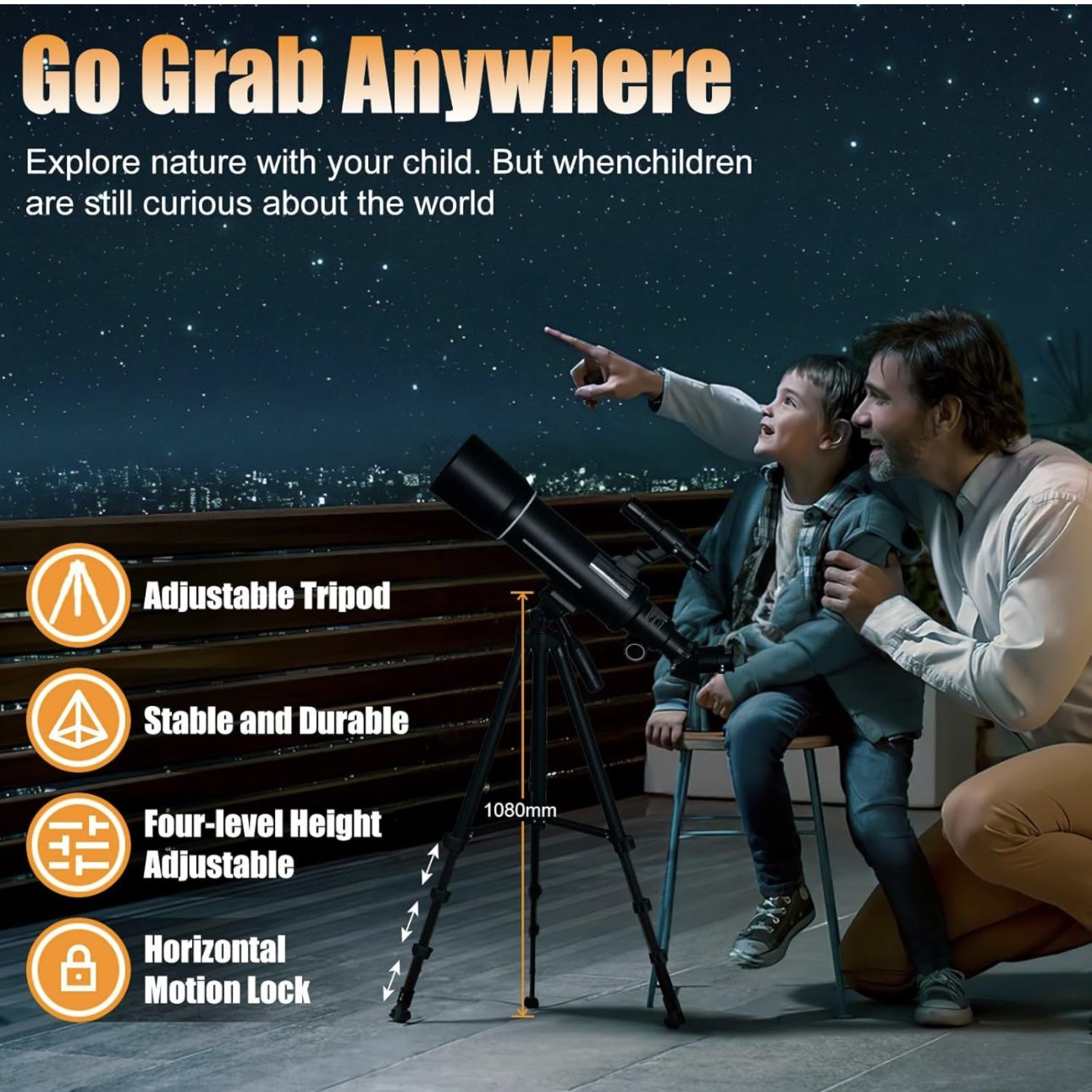 - Diseño portátil, localiza y graba fácilmente: ligero con una bolsa de transporte dedicada para un fácil transporte y almacenamiento, adecuado para educación familiar, actividades al aire libre y senderismo. Viene con un adaptador de teléfono para capturar y compartir imágenes, junto con un control remoto inalámbrico y un alcance buscador de 5 x 24 para una ubicación conveniente del objeto celeste, mejorando la flexibilidad de observación y la efectividad para diversas actividades astronómicas.